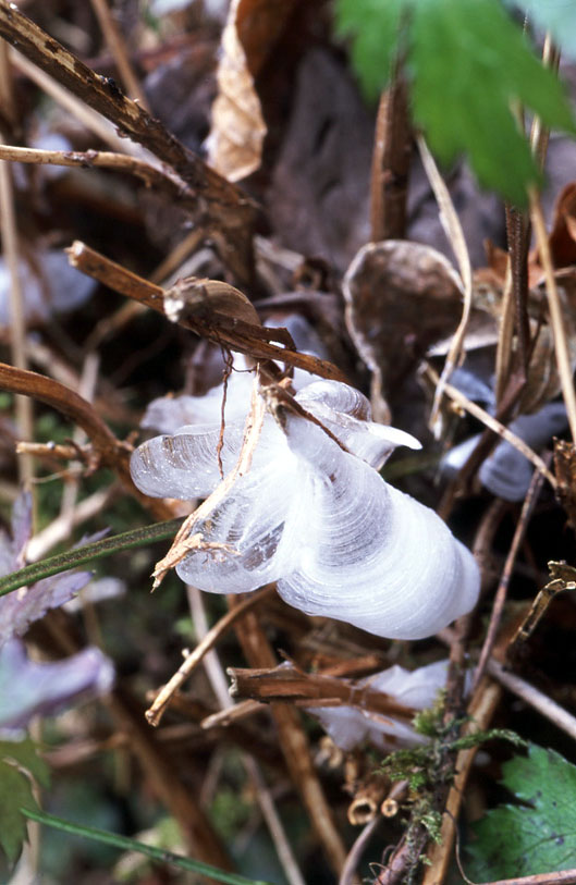 しまいそうな、繊細なガラス細工のような氷が。 咲き終わった秋の花は、初冬になると、地上部がほとんど枯れてしまうが、まだ根が残っていて、水を 吸い上げている。地上の温度が氷点下になると、吸い上げた水が凍って、このような氷の花を咲かせる のだという。 しみ出した水が徐々に凍ったのだろう、年輪を重ねるように、ヴェールのように薄い氷が広がっている。 まさに、自然の芸術だ。 実際、とても繊細で、うかつに触ると、たちまち壊れてしまうし、うっかり息を吹きかけたら、融けて しまいそうだ。撮影にはとても気を使った。 翌年(2002年)の冬、同じ場所、山あいの田んぼの土手に、また、氷の芸術を見にいった。ところが、 その小さな田んぼは、水路がコンクリートになり、土手がきれいに削られていた。 がっかりしたが、それ以上に、こんなところまで圃場整備して、何かメリットはあるのだろうか?とあきれた。 土手は削られたものの、全体的には大きな環境の変化はないようなので、数年もすれば、アキチョウジの 群落が復活し、霜柱の姿も再び見られるようになると思う。 その時に、また、会いに行こう。 アキチョウジ[分布]本州(岐阜以西)−九州 [花期]9−10月 こちらの写真もご覧ください。 ↓ |