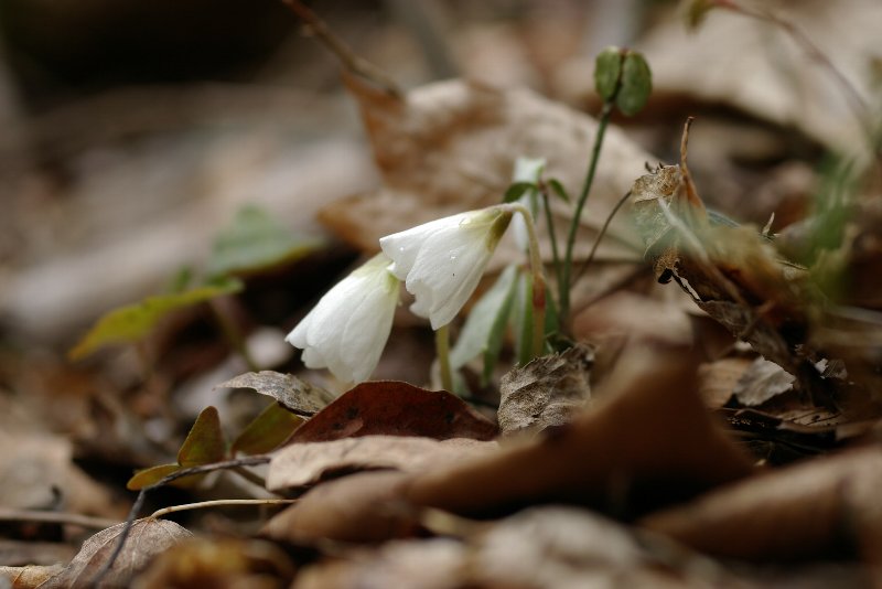 葉の形も独特で、覚えやすい花だ。 清楚なその花は、表情がとても豊か。 晴れたときは、賑やかな白い花がぱっと開き、嬉しそうに日の光を浴びている。 森の斜面に咲いた、小さな花束を見つけると、カメラを向けずにはいられない。 ぱっと咲いた花数輪、淡い新緑の葉、根元には冬を越したのであろう、濃い緑の葉、 これだけの美人にはなかなか会えないと思った。 雨やどんより曇ったときは、つぼんでうつむいている。特に春先は、落ち葉の間から、 ちょっとだけ顔を覗かせていることも多い。 そんな、 やっと顔を出した蕾、ご覧ください。 ↓ とってもかわいらしいじゃあ、ないですか。 [分布]本州(東北以南)、四国、中国、ヒマラヤ[花期]3−4月 |