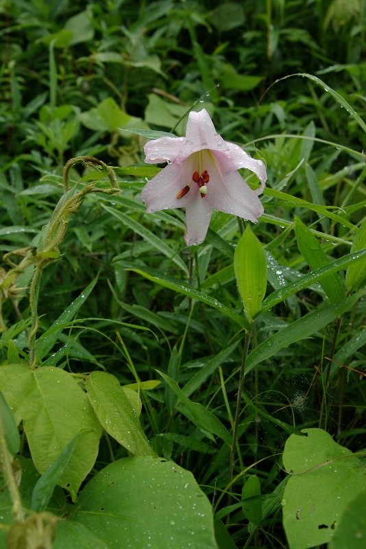 全然珍しくなかった。 通学路、と言ってもけっこういなか道だったが、初夏から夏にかけて、道ばたや土手に幾つも 咲いており、花をちぎって、たっぷりとある蜜をなめて遊んだものだった。 今や、ササユリは身近な花どころか、下手をすると、絶滅危惧種になりかねない勢いで減っている ようだ。原因は、生息環境の減少、野生動物による食害、それと言わずもがなの理由であろう。 野に咲く花は、野にあってこそ、美しい。自分のものにして愛でたい気持ちがわからないでもないが、 野の花は、庭や鉢に持ってきても、たいていは枯らすだけである。 溜池の土手の草むらに、埋もれるように咲いていた。雨上がりの露に濡れながら、背の丈ほども ある草をかき分け、近づいて撮った。葉は、本物のササに埋もれてしまって、写真では見えない。 この冬、その溜池が工事されていた。土手がコンクリート張りになってしまいはしないかと心配したが、 幸い、土手はそのまま残された。 ひとまず、ササユリも安泰である。 [分布]本州(中部以西)、四国、九州 [花期]6−7月 |