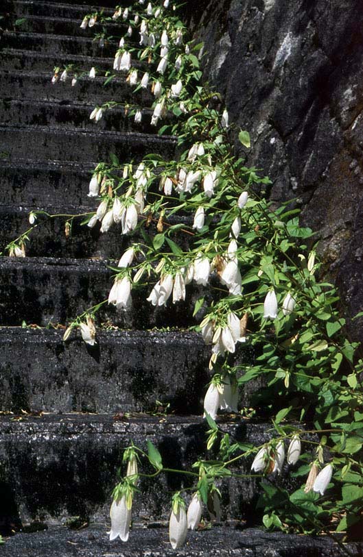 拙ホームページ「野花の写真帳」にホタルブクロが登場するのは、これで3回目である。 同じ花を何度も紹介するのは能がないなと思いつつ、また載せてしまったけど、私の 好きな花、ということで免除してください。 ほどほどに草刈されるような道端の土手で、よく見かける。ほとんど使われないような 道路の、ひび割れたアスファルトの隙間から、咲いていたりもする。 時には、 こんなところにも群生する。 ↓ 種が石段の隙間に散らばったのか、はたまた、地下茎を伸ばして一段一段登って行ったのか。 ホタルブクロの花の色には、ここに挙げたような白と、桃色のものと、2系統ある。 関西には圧倒的に白が多い。というか、白しか見たことがない。でも、故郷の愛知では、桃色ばかり だった。 このように、白系統と、赤系統の花の分布がはっきり分かれることで知られているものに、 ゲンノショウコやイカリソウがある。花好きな仲間内でも時々話題になるが、なぜ、このような 分布をしているのかは、わからないようだ。 [分布]北海道〜九州 [花期]6−7月 |