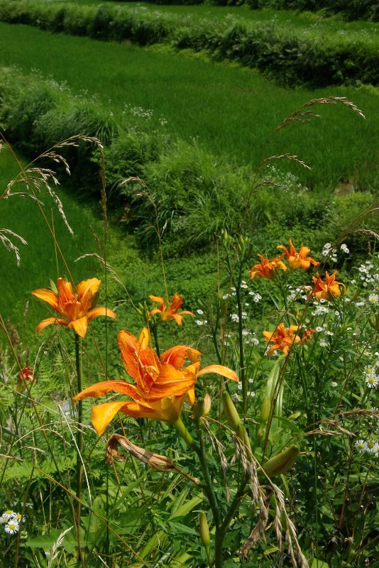 来たな、と思う。 濃い、燃えるようなオレンジ色。花の形も、燃え立つ炎のよう。いかにも、暑そうな、 夏にお似合いの花だ。濃くなった稲の緑にも、よく映える。 棚田の土手に、ヒメジョオンや他の草と絡み合うように咲いていた。雑然としていたが、 ほとんど整理せず、そのまま撮影した。 夏らしい気分が出せたと思うが、いかがでしょう。 ヤブカンゾウの若芽を和え物にして食べたことがあるが、癖がなく、おいしかった。 春、田んぼのあぜ道には、 ヤブカンゾウがいっぱい芽吹くので、 ↓ いちど、お試しあれ。 でも、芽生えはいっぱい群生していることが多いのに、花は、そんなに、数多くはかたまって咲かない。 花をつけられるほど、エネルギーを蓄えられる株は限られるのだろう。 [分布]北海道〜九州 [花期]7−8月 |