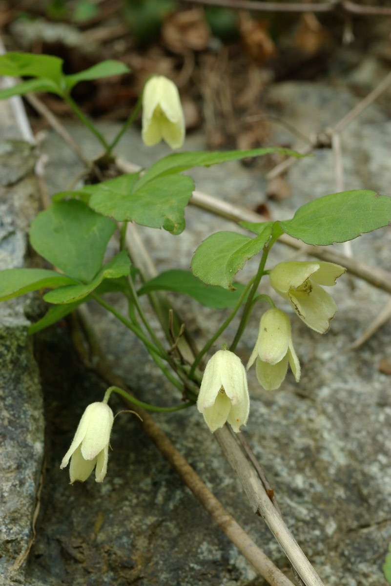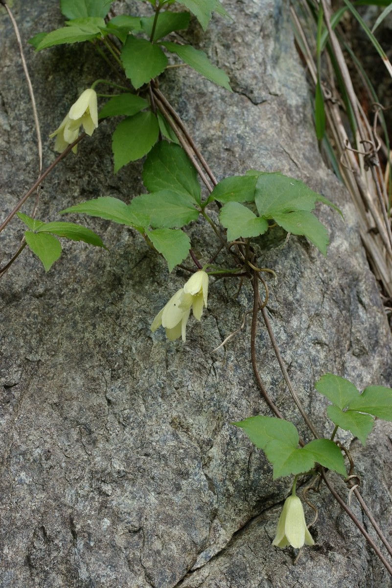 林道の斜面の岩に、張り付くように咲いている、淡い黄色のつる草を見つけた。