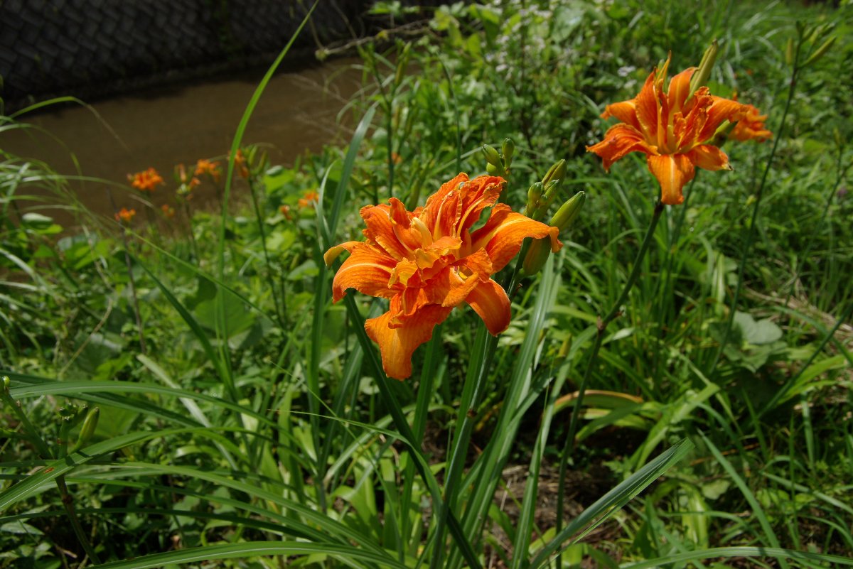 ギラギラとした日差しの中、濃い緑の草むらで咲いている鮮やかなオレンジ色ヤブカンゾウの花を見ると、 今年も本格的な夏がやってきたことを感じさせる。