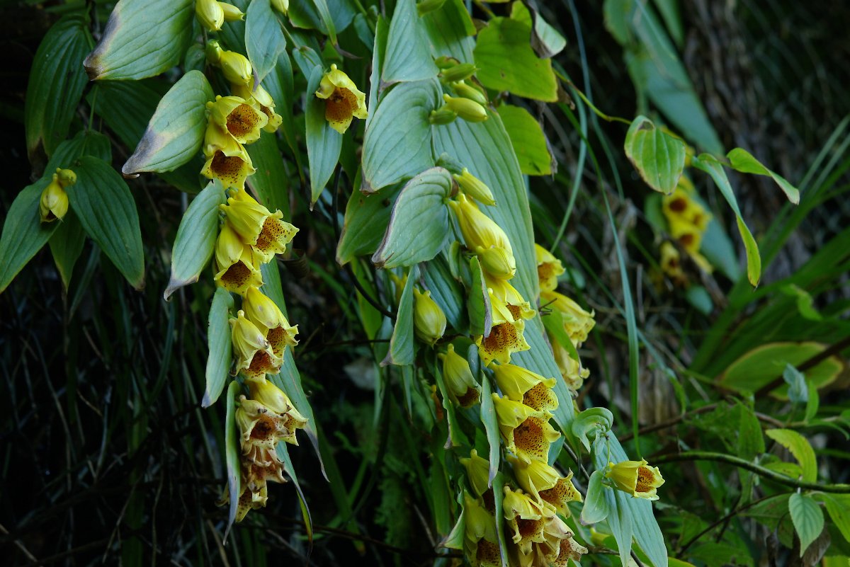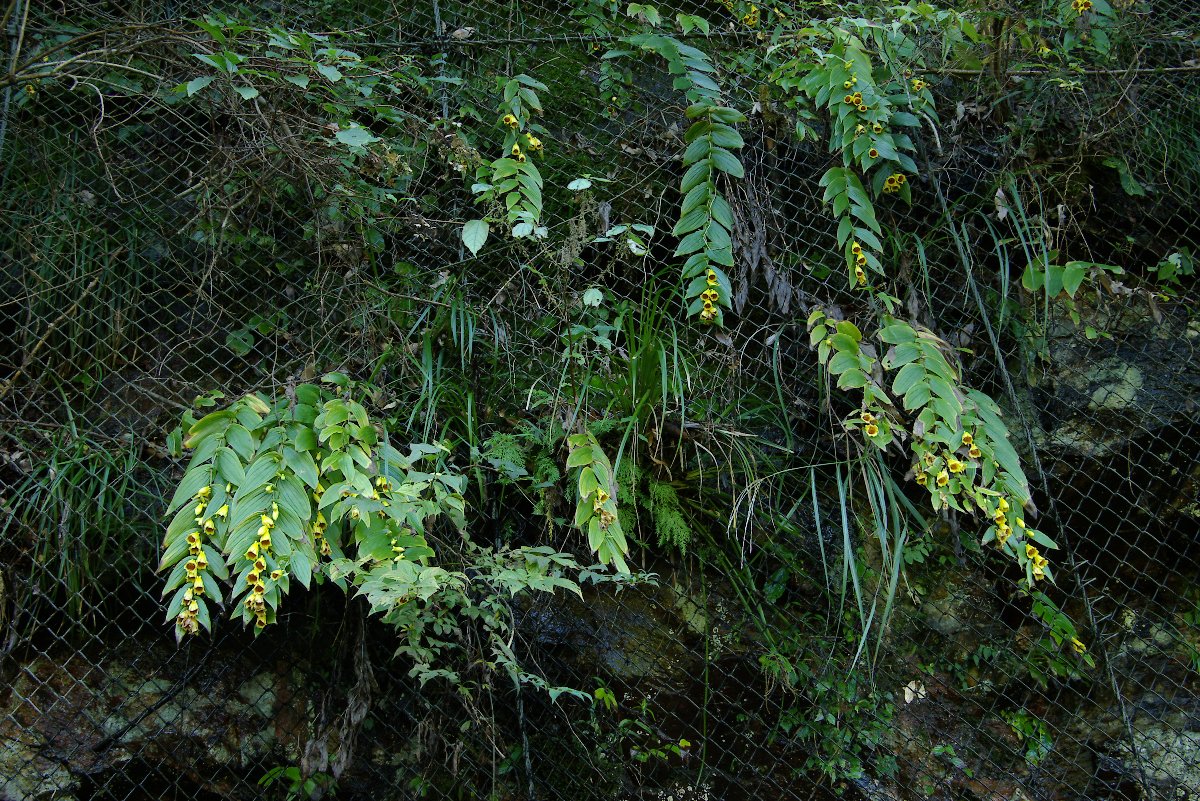キイジョウロウホトトギスは、数ある関西の名花の中でも、その筆頭に挙げられるものだと思う。 なので、「関西花しるべ1」に続いて、再びの登場です。 紀伊半島は、切り立った深い谷が多く、容易に人を寄せ付けない。そんな、人の手の届かない川沿いの岩場に、 キイジョウロウホトトギスの自生を見ることができる。 しかし、ここで見た群落は、なんと、 崩落防止のフェンスの間から、たくましく伸びて、花を咲かせていた。 ↓ 撮影には向かない被写体かもしれないが、こうして、咲いている姿を見ると、簡単には絶滅などしないぞ、 といった、したたかささえ感じる。 ただ、「花しるべ1」で紹介した群落は、その数年後訪れた時、ほとんど、跡形もなくなっていた。 誰かが、ごっそり盗掘したとしか思えない。残念なことだ。 [分布]紀伊半島 [花期]9−10月 |
