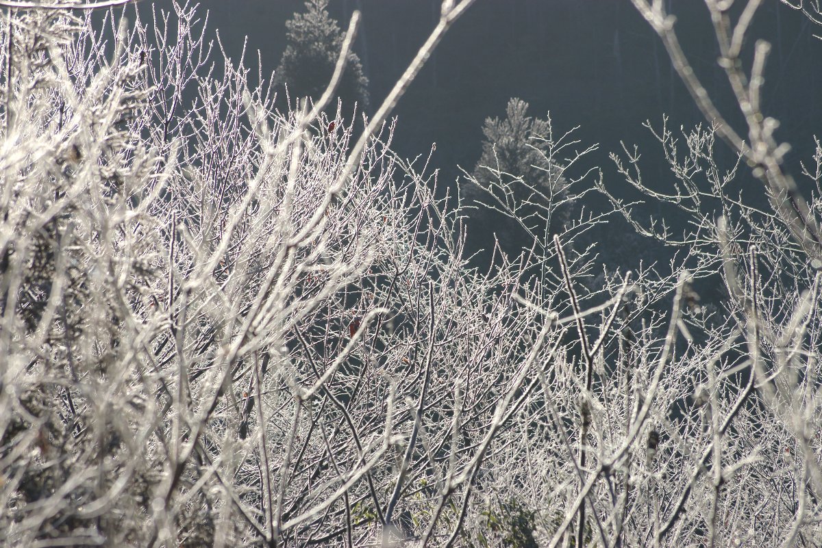 この写真と、次の写真は、少し、趣を異にする。 主役は植物でなく、霜。果たして、これが名花なのか?と言うなかれ。冬に咲く、美しい「花」であることには、 まちがいない。 兵庫県南部でも、年に1度くらいは氷点下5度くらいまで冷え込む朝がある。 そんな朝に、野山に出かけると、地面も、木々も、びっしりと白い霜に覆われている。 びっしりと木々に降りた霜のことを、樹霜と言う。 冷え込んだ朝、がんばって出かければ、そんなに山奥でなくても、このような美しい景色に会えるのだ。 |