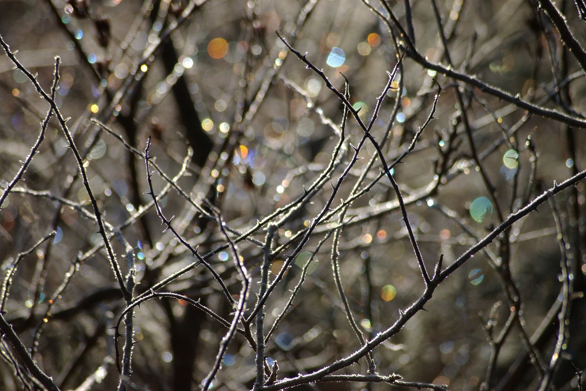 びっしりと木々に降りた霜も、遅い朝日が当たるや否や、一気に融け始める。 その瞬間、プリズムのように、きらきらと七色の光を放つ。 肉眼では、とても美しい一瞬。だが、これを、カメラに捉えるのは難しい。 少しピントをぼかして、なんとか、青や緑やオレンジに輝く光の色を捉えられた。 だが、目で見る、何十分の一の美しさでしかない。 霜が、七色の光を放って融ける瞬間を表す言葉を探したが、見つからなかった。 やむを得ず、そのまま「融霜」という造語を当てた。 |
