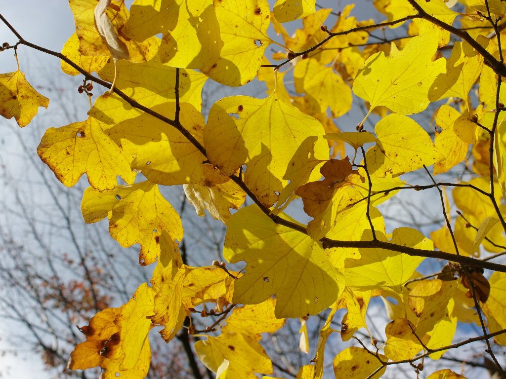 はらはらと葉を散らし始めていた。 紅葉がきれいな年は、この葉っぱが、混じりけのない黄色に染まる。今年は、 まずまずのようだ。 |