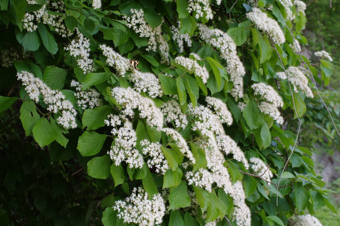 道路に面した崖に、大きなガマズミの木が、細かい花をいっぱい広げていた。 緑が濃くなったこの季節、白い花が、山の景色に映える。 |