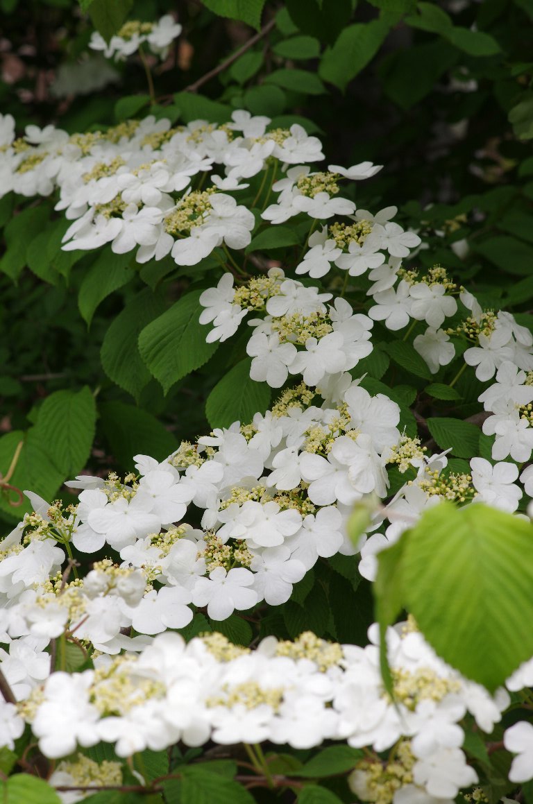 初夏の山を飾る、白くて、丸い、ヤブデマリの花。 だんだん濃さを増してきた新緑に、ひときわ映える。 |