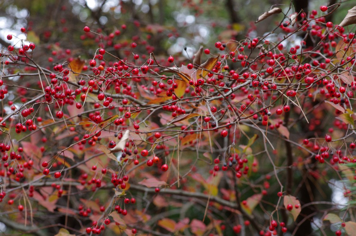 鈴生りの赤い実。いったい、なんだろうと思って近づくと、カマツカだった。 いつもより何倍も多い実をつけているので、知っているはずの木の実も、別のものに 見えてしまう。 |