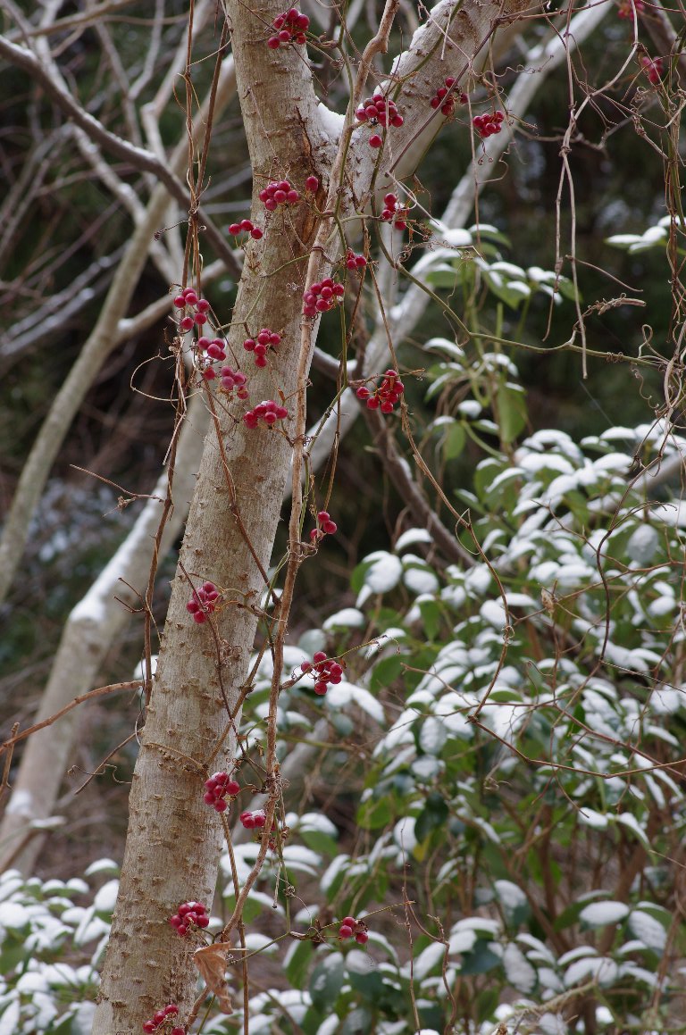 撮影雑記: 木の花や木の実の当たり年だった2011年の名残りは、その冬まで続きました。 1月に、いつも行く三田の山道をドライブしていると、蔓性の植物、サルトリイバラや ツルウメモドキの見事な実が、木の枝に絡みついていました。 秋にも何回か訪れていましたが、その時は気がつきませんでした。葉が茂っていた頃は、 隠れて見えなかったのでしょう。 下から見上げた写真がおもしろかったので、それを選びましたが、絡み付いている様子は、 ちょっと分かりにくいと思います。 横から見た写真です。 ![]() このように、太い幹に、絡み付いていました。 絡まれているのはカラスザンショウですが、ここらの谷は、カラスザンショウの群落になっていて、 大きく伸びたカラスザンショウで、谷が埋め尽くされています。 |
