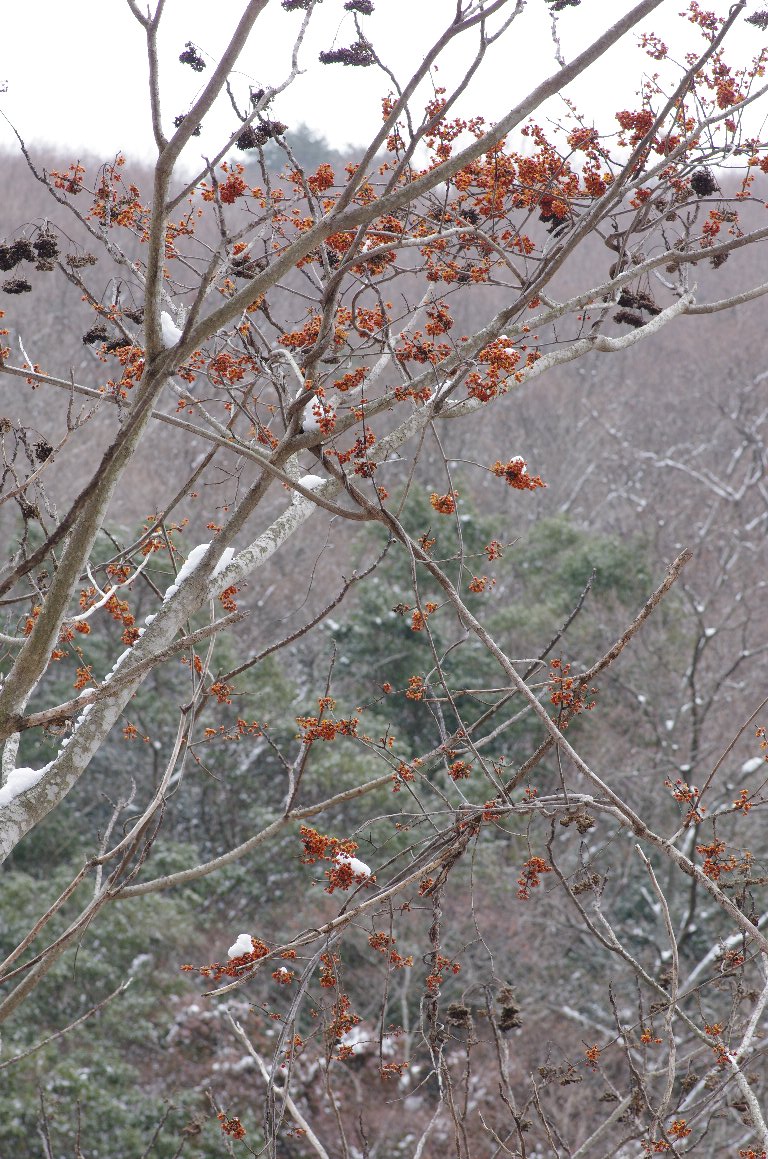 木の枝の高いところに、たわわに稔ったツルウメモドキの実が絡みついていた。 生け花によく使われるツルウメモドキの実だが、見事な自然の造形に、なるほどと思った。 |