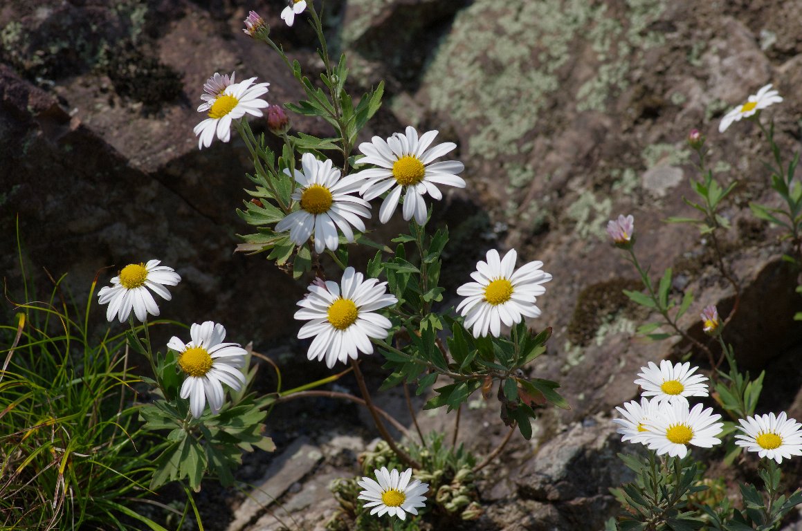 徳島の那賀川の渓流に咲くナカガワノギク。 2年前に訪れた時より少し早めの時期に来たのがよかったのだろう、岩場の至る ところで満開の花をほころばせている姿に会えた。 |