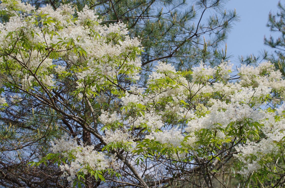 新緑が終わり、木々の緑が濃くなってくる頃、白い、ふわふわとした木の花をよく見るようになる。 いろんな種類の花が咲いているが、最もふわふわ感のあるのは、このアオダモだろう。 |