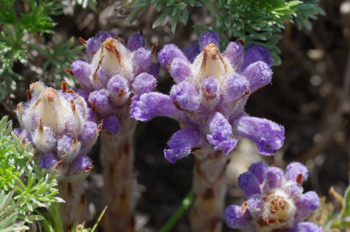 海岸の砂地に、突如、すっくと茎を伸ばして、紫色の花を咲かせているハマウツボ。 寄生主のカワラヨモギの緑の葉が、まるで、自身の葉のように見える。 まあ、当たらずとも遠からずなのだが。 |