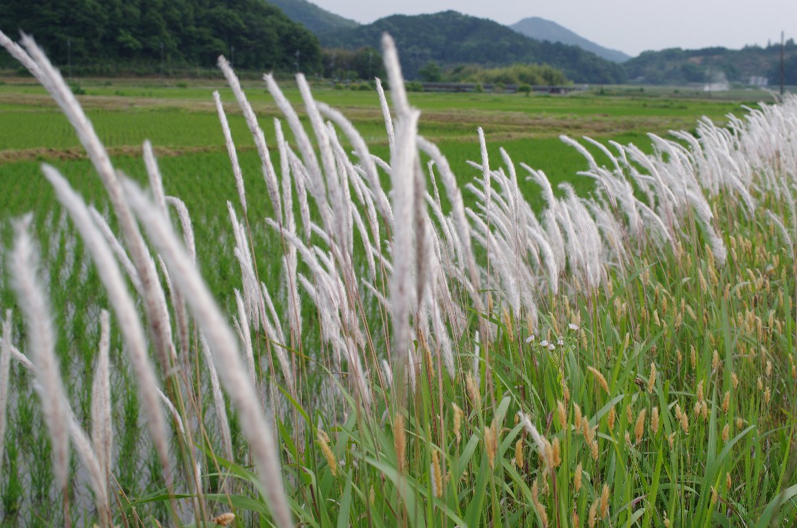 夕暮れ間近、川沿いの県道を車で走っていると、土手に連なったチガヤの白い穂が、弱い西日を