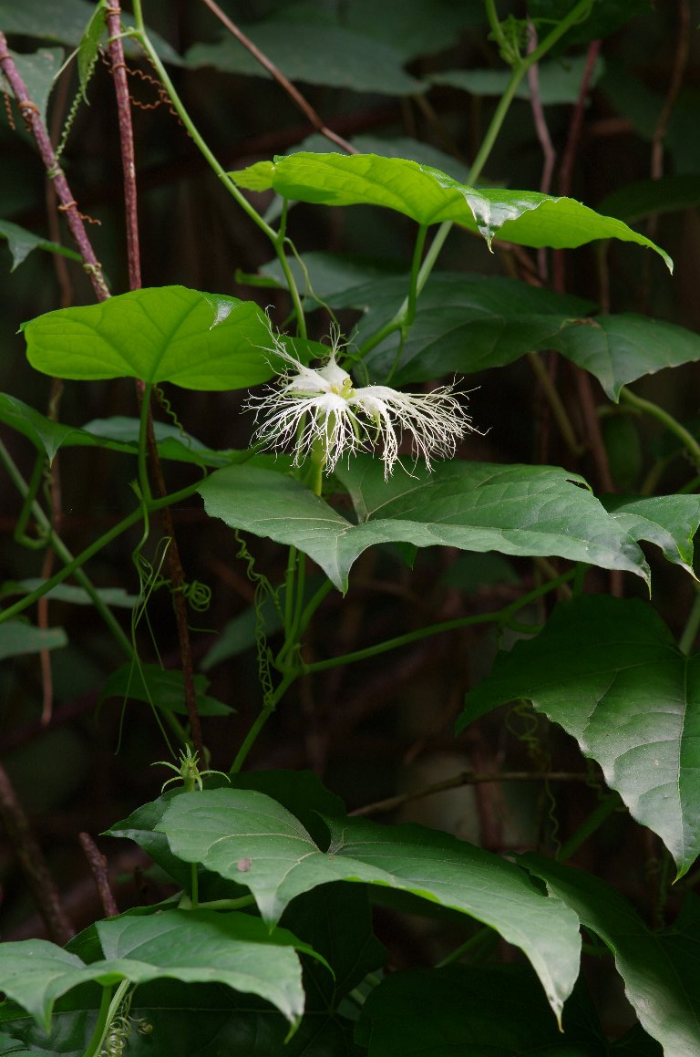 撮影雑記: 12月に、偶然見つけた、キカラスウリの実。 私には、初めて見る、自生のキカラスウリの実でした。 その様子は、こちら (2013年12月冬至−キカラスウリ) に載せていますが、実を見たからには、次は、花を見なくてはと思いました。 花が咲くのは夏。それも、夜中です。 自然光で写真を取ろうと思ったら、早朝、まだ、しおれずに残っている花を狙うしかありません。 でも、夏の朝は早い。 うんと早起きしなければなりません。自生地まで、車で50分くらいかかることを考えると、家を出るのは4時。 それでも、意を決して、出かけてみました。 着いてみると、ありました、ありました。 ちょっと、元気がなくなっている感じですが、なんとか、咲いている花が数輪あります。 でも、まだ、薄暗い。 露出を合わせると、シャッター速度は、なんと、2秒、3秒という長さ。 幸い、ほとんど無風だったので、きれいな写真を撮ることができました。 キカラスウリの蔓の様子は、こんな感じです。 ![]() |