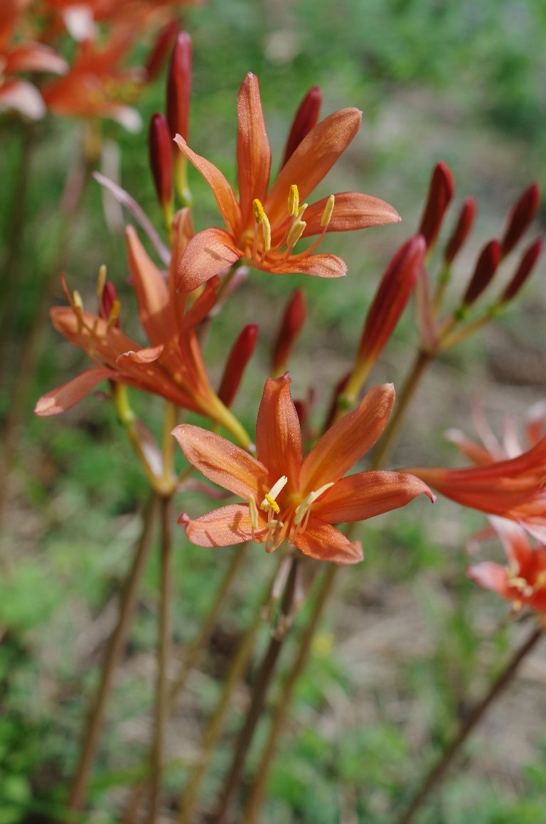 日当たりのよい道路わきの一角に、燃えるような橙色の、キツネノカミソリの花が