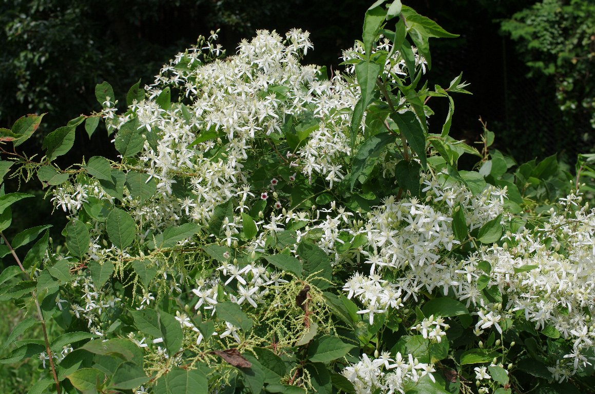 9月上旬のころ、やぶのまわりに、忽然と現れる白い花のかたまり。それがセンニンソウだ。 今まで、緑しかなかったところに、花飾りのように、白い花が覆いかぶさって咲く様は、 いつ見ても、なかなか見事だ。 |
