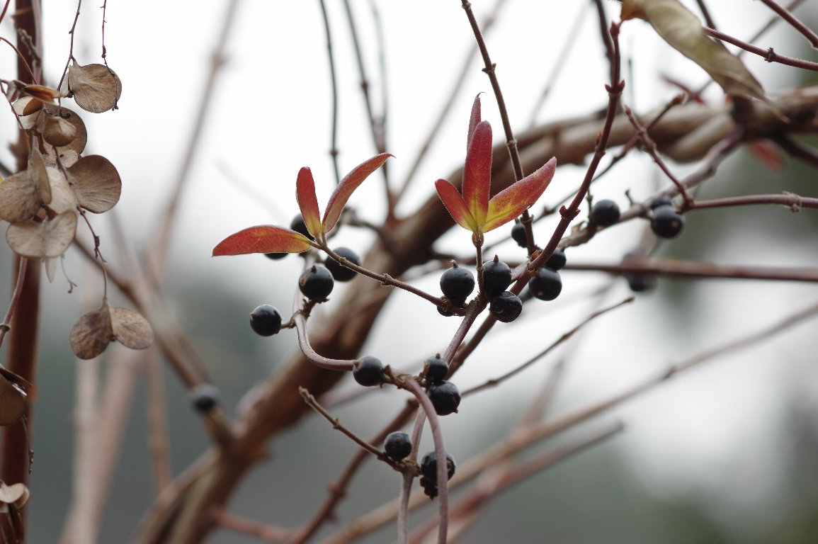 蔓のように伸びた枝に、見慣れない黒光りする実がついていた。スイカズラの実だ。 冬場にも葉をつけて、寒い冬を耐え忍ぶ姿から忍冬の名があるが、こんな実を付けるとは、 この時まで知らなかった。 |