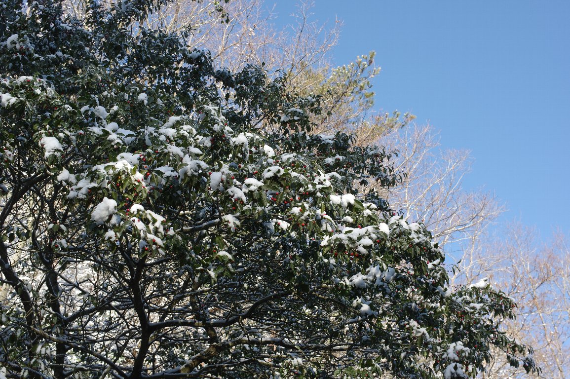 つやつやとした厚みのある緑の葉と、赤い実のコントラストが美しいソヨゴの木。 この日は、降り積もった雪の白も加わって、赤、緑、白3色のコントラストが、まぶしかった。 |