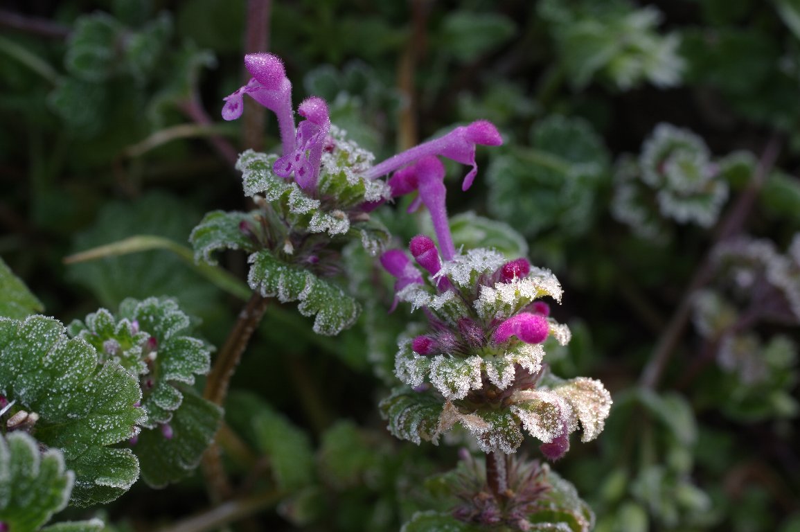 道端の、畑のホトケノザ。 ようやく、花が咲き始めたものの、まだまだ、冷え込みが厳しい、3月上旬の朝。 霜に覆われて、こごえているようでした。 |