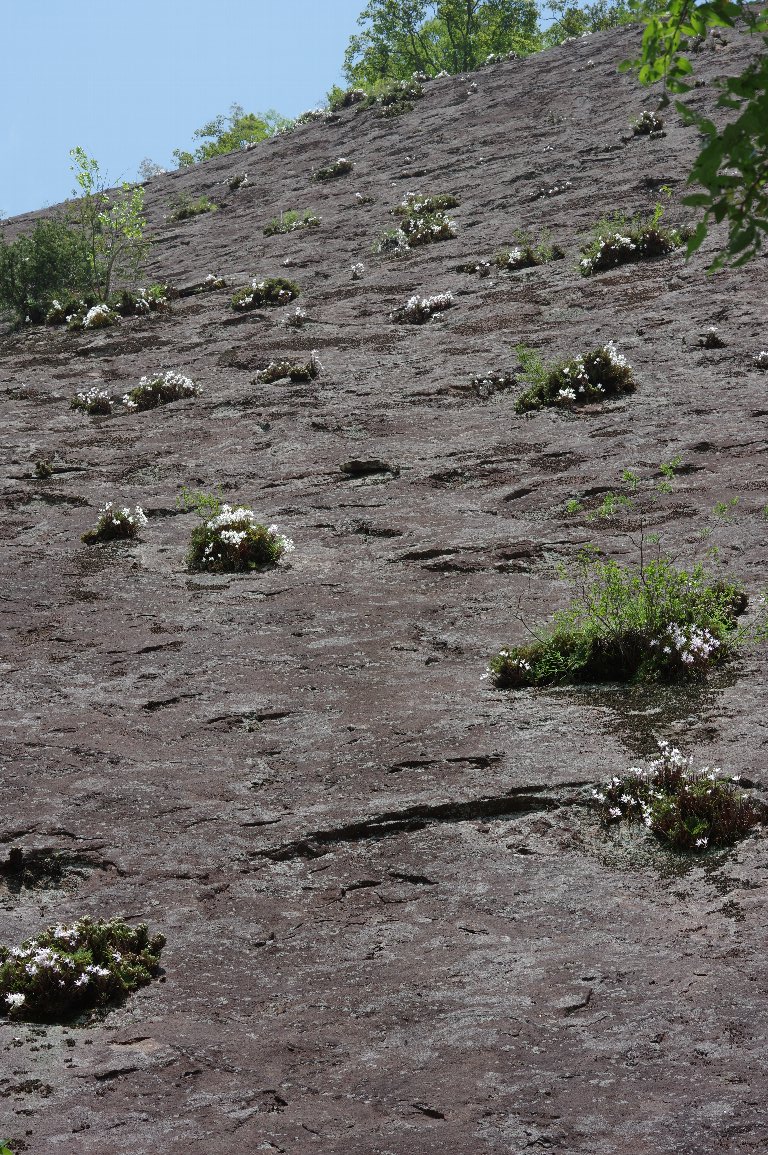 撮影雑記: 半島の名がありますが、紀伊半島は山深く、ちょっと出っ張った、列島の一部と言っていいでしょう。 半島自体が、険しい山林地帯です。 そこを流れる渓流の岩場に、セッコクが自生しています。 人目に付きやすくて、美しい花を咲かせるセッコクは、すぐに採られてしまいますから、 人の手の届く範囲にはありません。 でも、人の手の届かない、いや、到底、人が近づけない断崖絶壁には、かなりの数の株があり、 シーズンになると、可憐な花を咲かせます。 久しぶりに、そんなセッコクに会いたくなって、南紀まで訪れました。 期待通り、岩場のあちこちに、花をいっぱいに付けたセッコクが、待っていてくれました。 ![]() それにしても、すごい、岩場。 着生植物とはいえ、よく、こんな環境で、生きていられるものです。 夏場など、ギラギラと太陽に照り付けられ、そうとう、過酷な環境でしょうに。 でも、セッコクにとっては、競争相手もいないし、ちょうど良い環境なんでしょうね。 わずかにピンクがかった白い花が、折からの強い風に、たなびいていました。 |