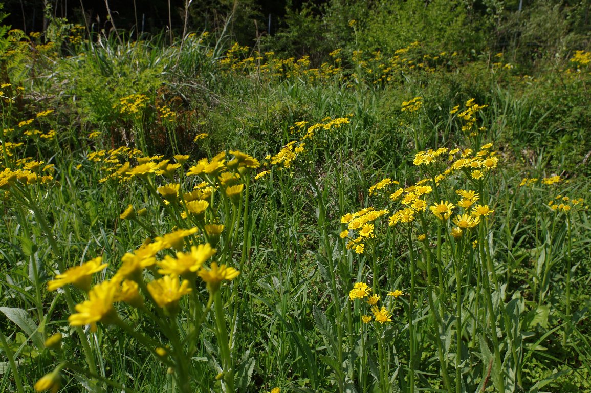 小さな田んぼが続く、山あいの道を走っていると、黄色い花の集団が目に止まった。 車を停めて、近づいてみると、サワオグルマの群落だった。 湿田の休耕田に、今は盛りと咲いていた。 |