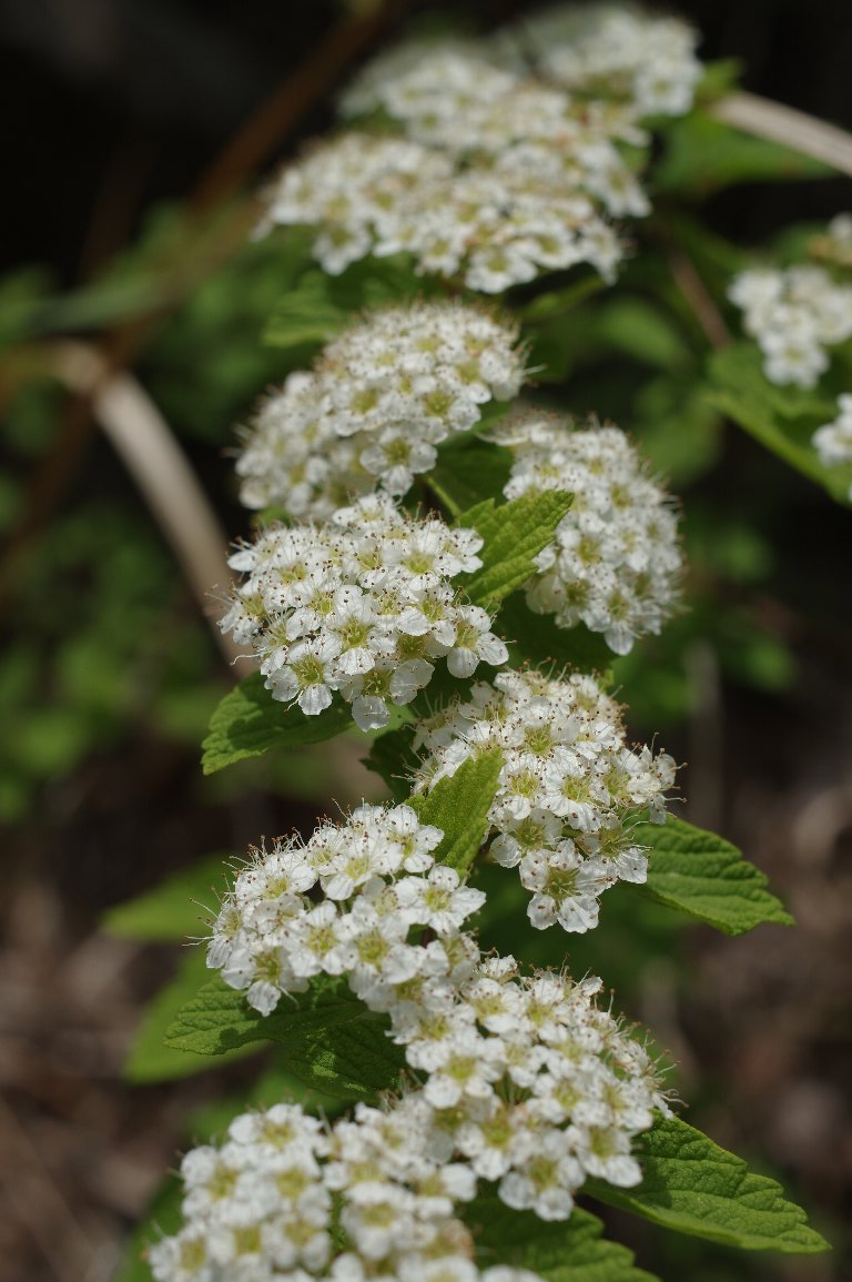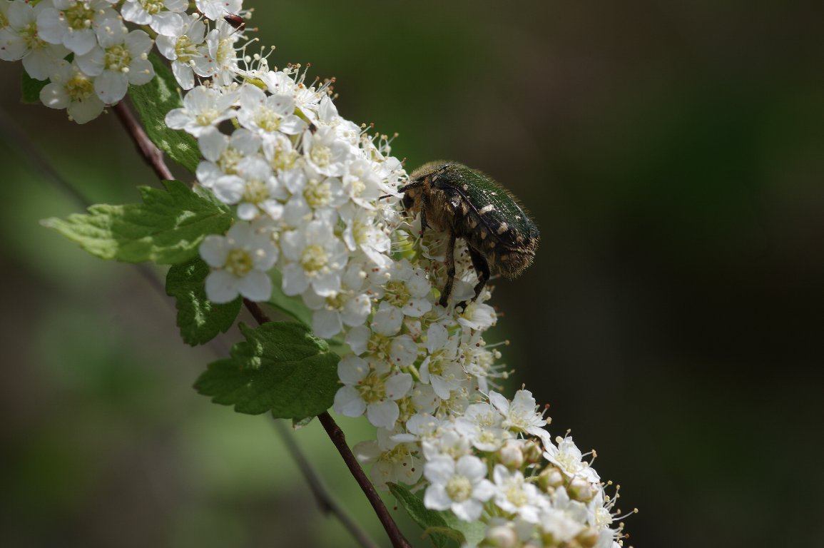 撮影雑記: 南限のミズバショウ自生地がある、養父市の加保坂あたりの蛇紋岩の山咲くシモツケの花が、 ずっと以前から気になっていました。 上でも書いたように、今回、しっかり調べてみました。 その結果、イブキシモツケとイワガサの2種類に絞り込めましたが、最後の決め手に欠き、 どちらとも決めきれません。 それでも、図鑑や、ネット上のいろんな記述を片っ端から読んで、おそらく、イブキシモツケ だろうという結論になりました。 ネット上の記述も、けっこう、あいまいなんですよね。 イワガサの名前の方がカッコいいので、イワガサにしたかったんですけど、やっぱり、 イブキシモツケでしょう。 花に近づくと、こんな感じです。 ![]() もっとも、シモツケ類の花は、どの種類もそっくりで、花では、なかなか区別がつきません。 ハナムグリやハチなど、昆虫たちもたくさんいました。 こちらは、ハナムグリのアップです。 ![]() 初夏のころは、このような、白くて細かい花が多く、虫たちが大活躍です。 |