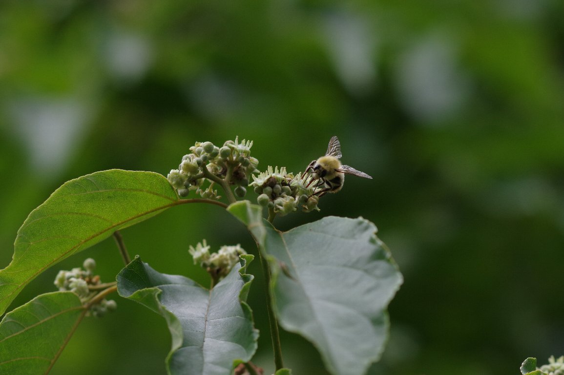 秋、枝が太ったような、妙な形の実が生るケンポナシ。夏の初め、こんな地味な花を付ける。 花は地味だが、訪れる虫たちはひっきりなし。ハナバチ、スズメバチやハナムグリが、忙しそうだった。 |
