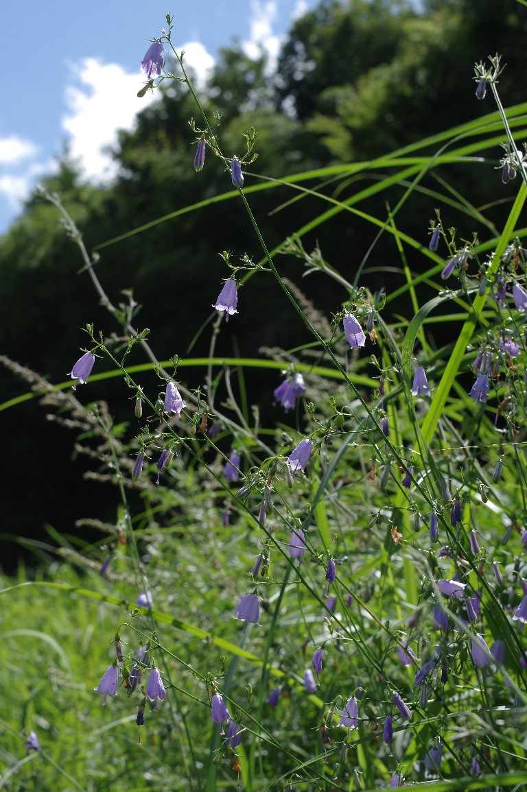 適度に草刈りされている田んぼの土手は、いわば、小さな草原だ。 秋になると、そんな田んぼの土手に、様々な、草原の花が咲く。 ツリガネニンジンも、そんな花の一つで、ススキに絡まるように咲いていた。 |