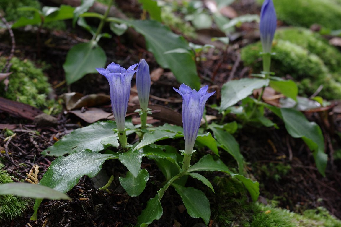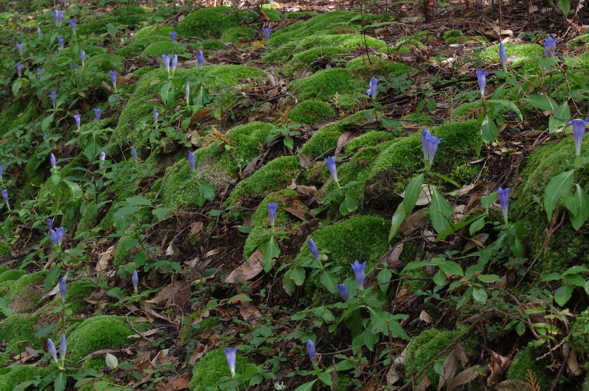 小さいながらも、水平に展開する葉の上に、きりっとした花を付けるアサマリンドウ。 木立の下に群れ咲く瑠璃色の花は、日差しを浴びて、神秘的な光を放っていた。 |
