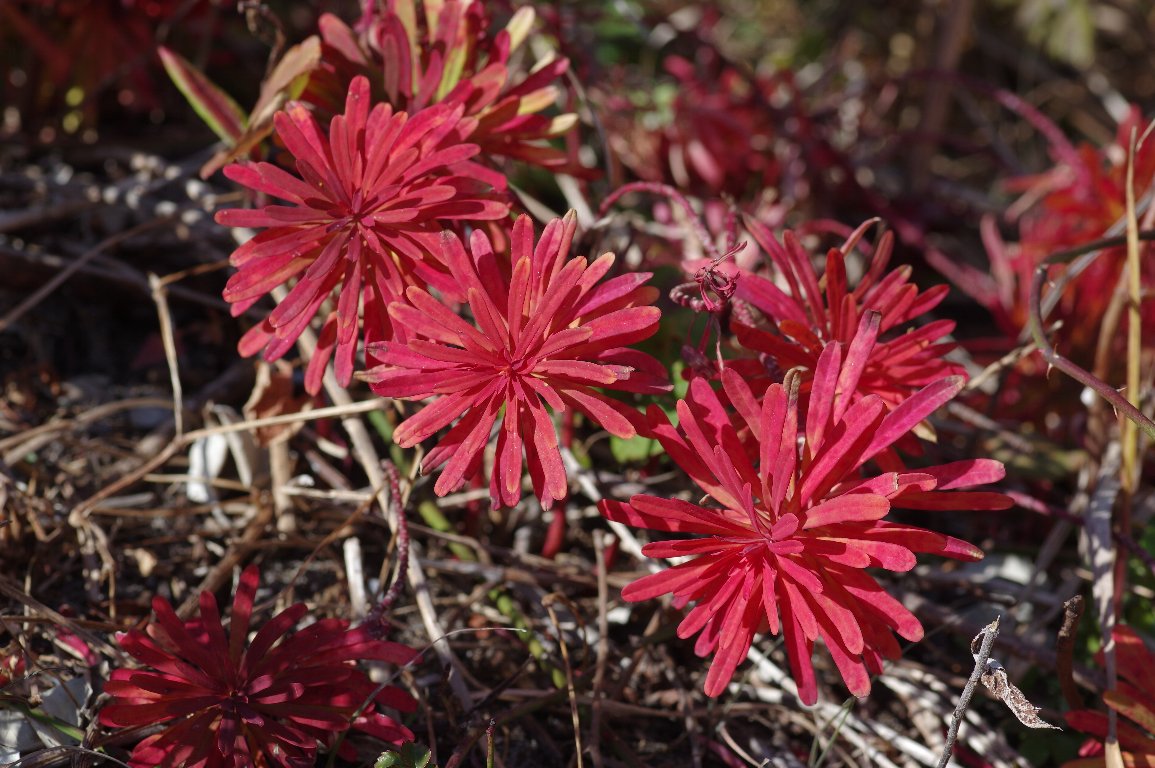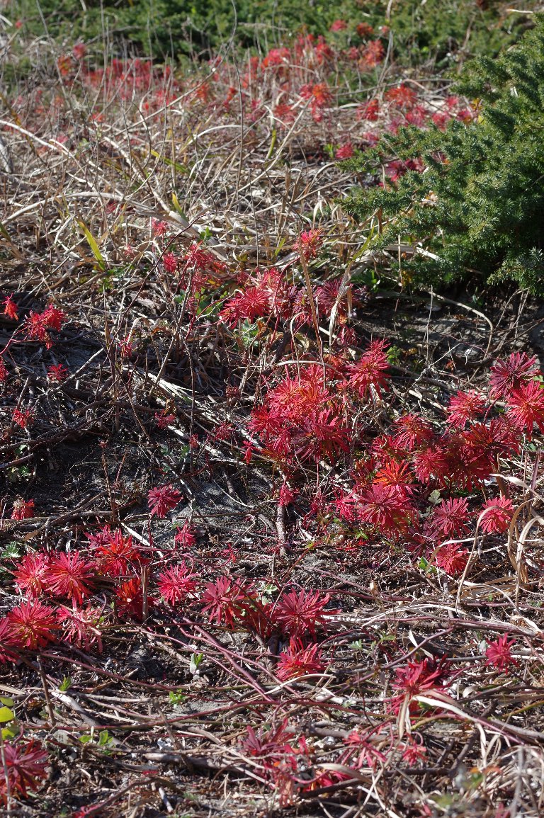 冬の浜辺で、葉を赤く染めているのは、ハギクソウ。 まさに、その名のごとく、真っ赤な菊の花が咲いているようだ。 久しぶりに訪れた自生地だったが、以前より数が増えているようで、うれしい。 |