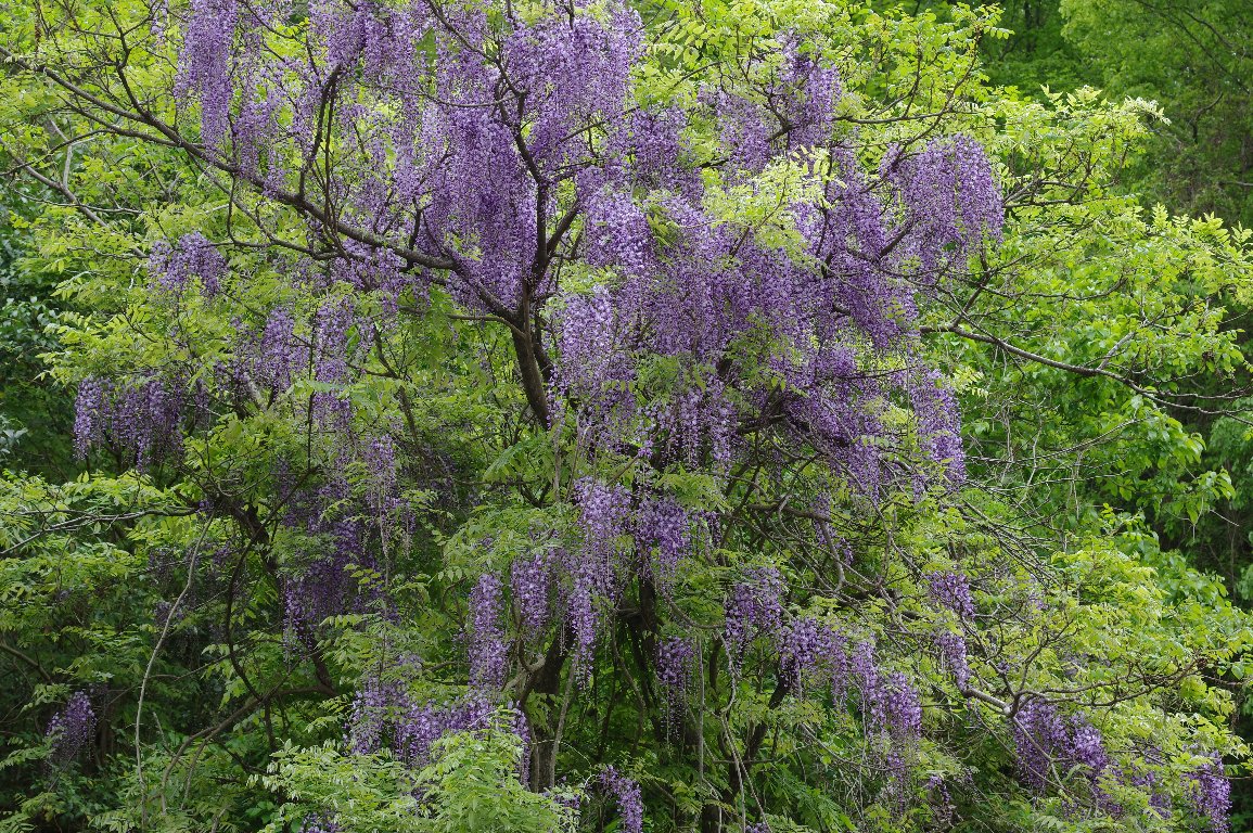 フジの当たり年は、数年おきにやってくるようで、2015年は当たり年だった。 あっちの山に、こっちの木々に、フジが花盛り。 この、フジ園かと思うほどの見事なフジも、道端に咲いていたもの。後ろの電線が、 それを物語っている。 |
