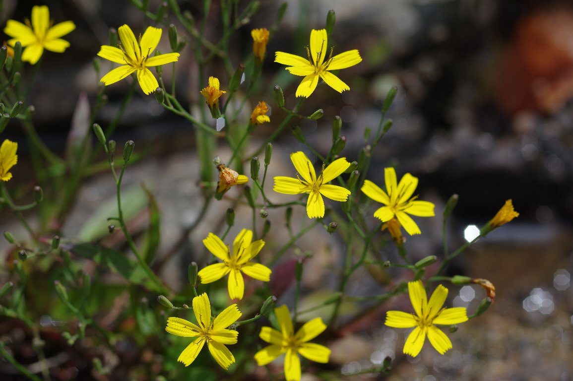 中流域の岩場の河原、ちょろちょろ水が流れている場所に、ニガナの花が咲いていた。 洪水になれば、水を被るようなところなのに、タフな花なんだろう。 初夏の強い日差しを浴びて、キラキラ輝いていた。 |