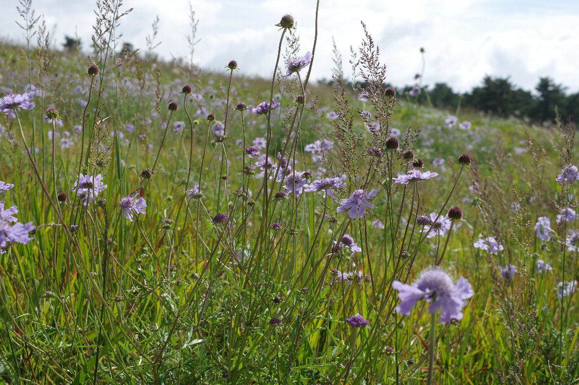 何年か振りに見た大山のマツムシソウは、雄大な山容を背景に広々と草はらに拡がり、