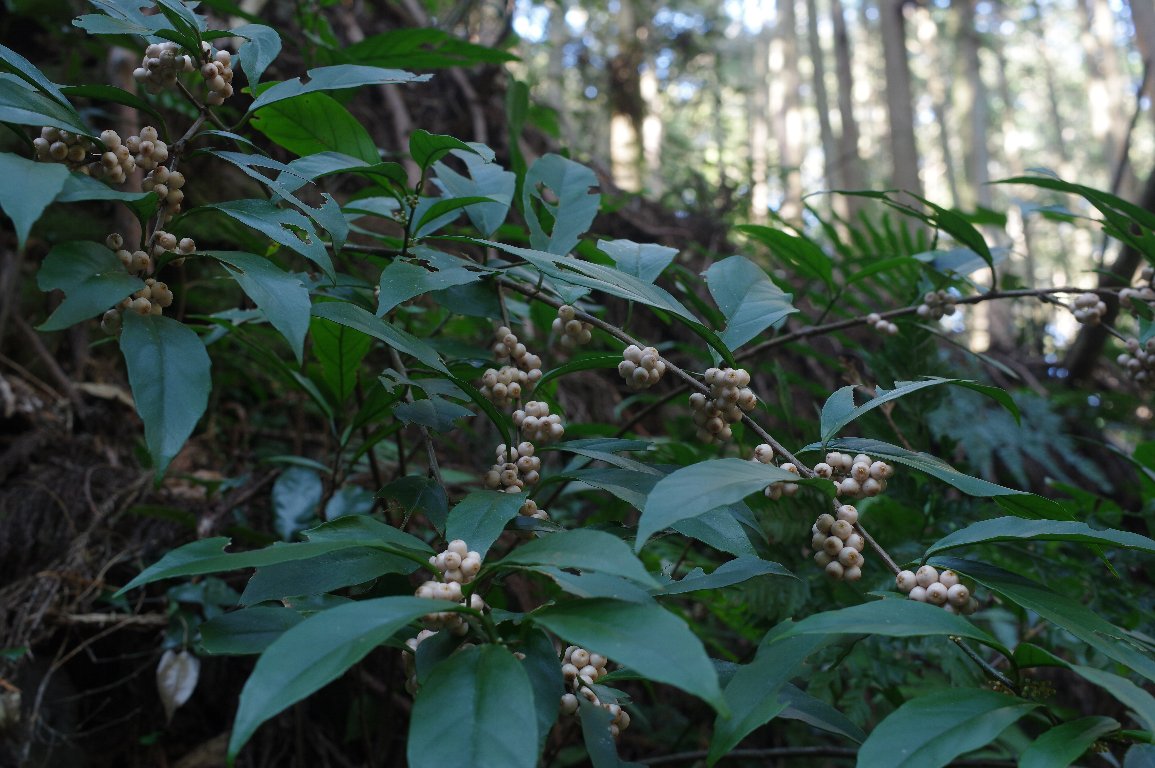 イズセンリョウは、冬の林の下に、ひっそりと白い実を実らせている。 この冬は、その姿を写真に撮ろうと、正月の帰省の折、自生場所を訪れた。 カーブを曲がると、林道わきに、きれいな白い実を付けたイズセンリョウが待っていた。 |