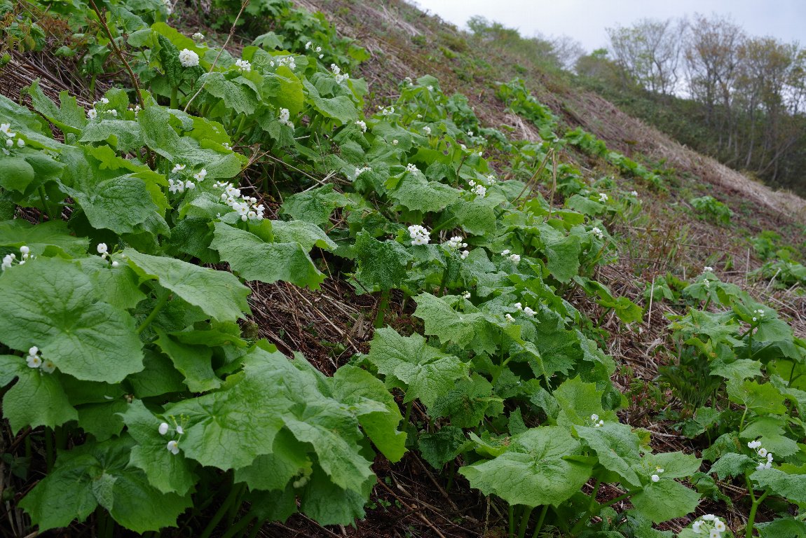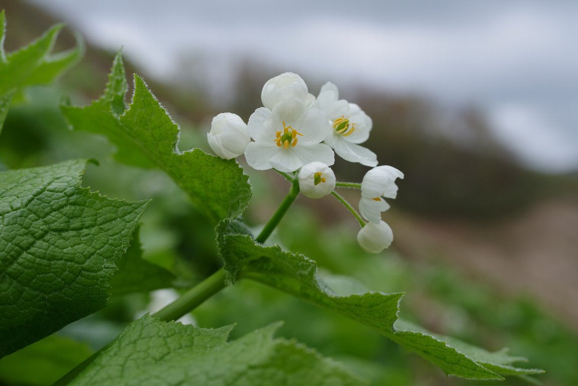 切り開かれた山の斜面に、サンカヨウの群落が広がっていた。 すがすがしい白い花が、あちこちで咲いている。 吹く風は少し冷たかったが、熱い気持ちで、撮影した。 |
