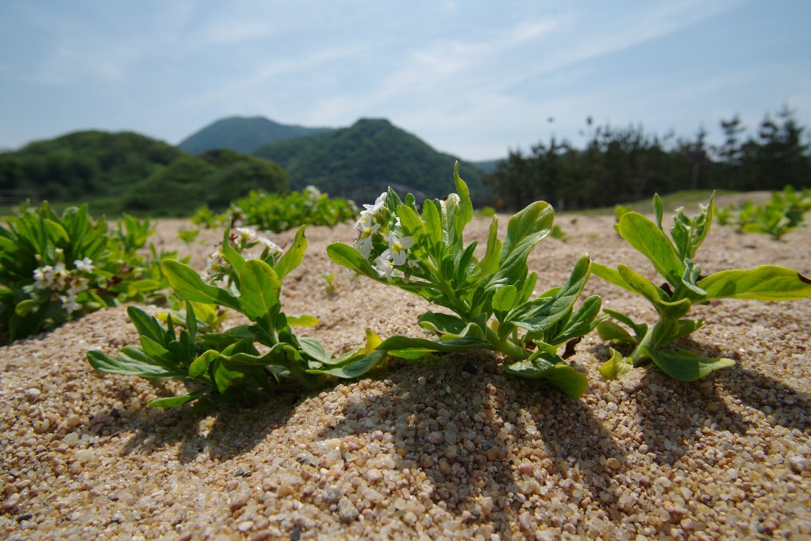 初夏の頃、海岸の砂浜に白い花を咲かせるスナビキソウ。 花の時期が短いのか、出会うのは、いつも、少し傷んだ花ばかりだったが、ようやく、 きれいに開いた花に出会うことができて、うれしかった。 |