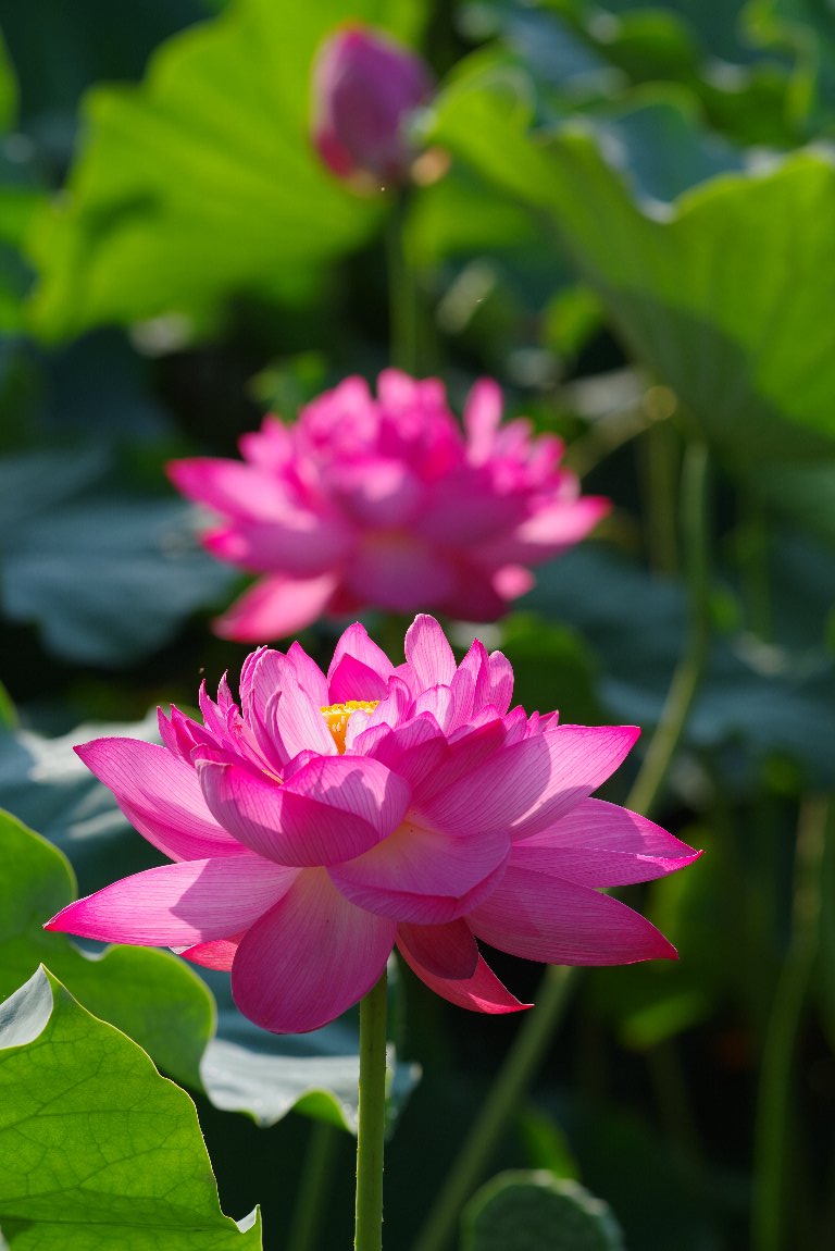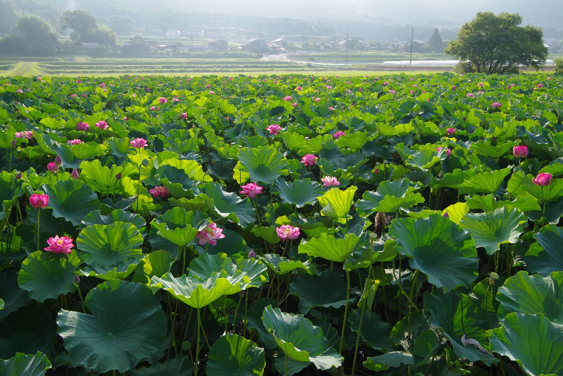 ハスの花は、早朝に開く。みずみずしい花を見たければ、うんと、早起きしなければならない。 何とか頑張って、この日は7時頃に到着。夏の朝日は、もう、山から顔を出していたが、 逆光で見るハスの花が、とてもきれいだった。 |