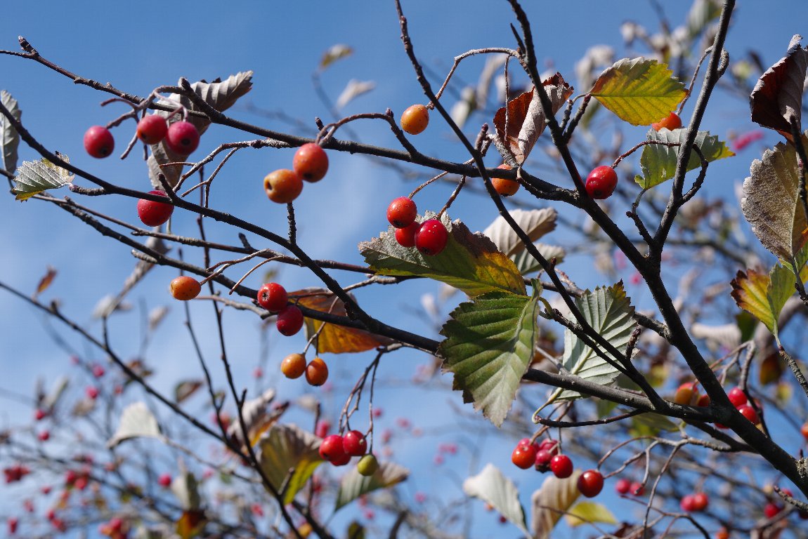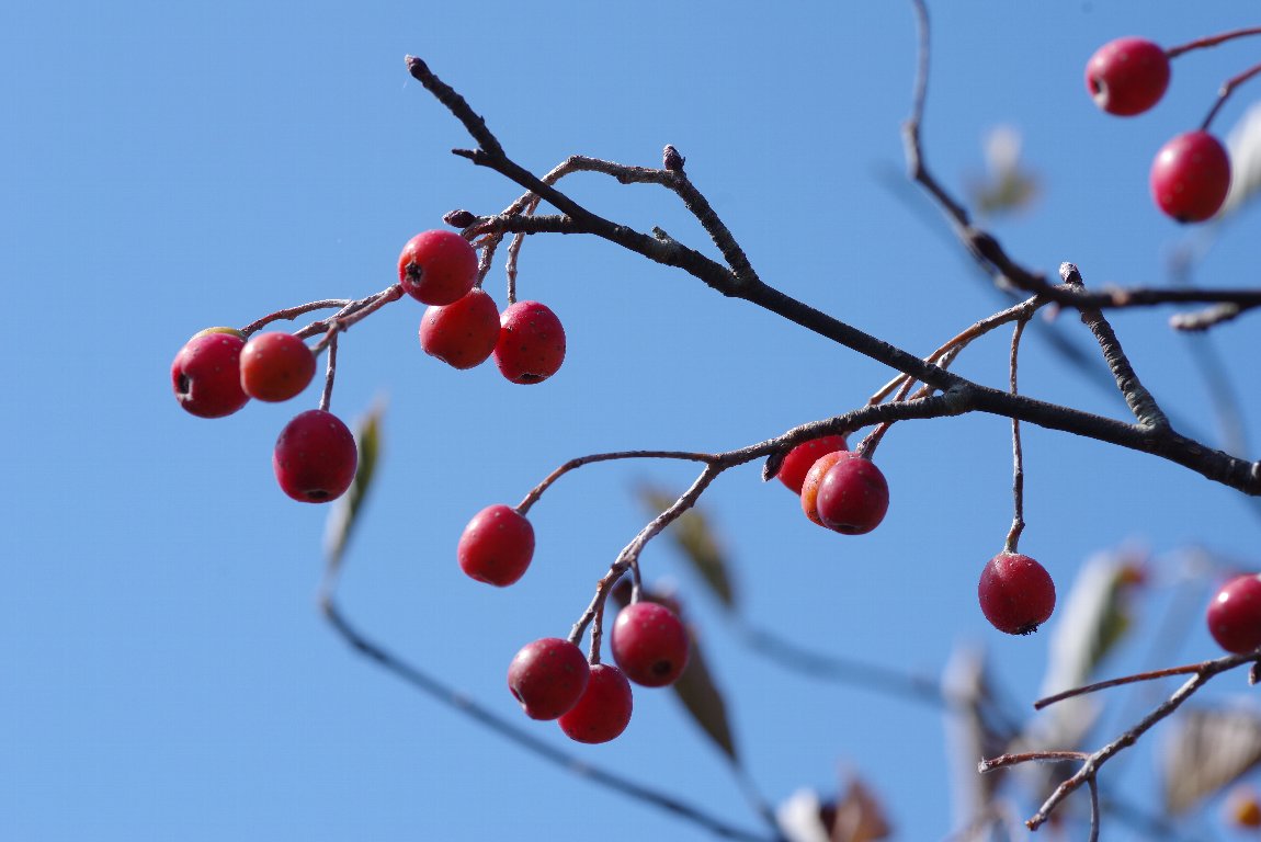 尾根道を歩いていると、たわわに赤い実を付けた木に遭遇した。 アズキナシかと思ったが、葉っぱの形がちがう。後で調べて、ウラジロノキとわかった。 青空に、少し縦長の実が、よく映えていた。 |