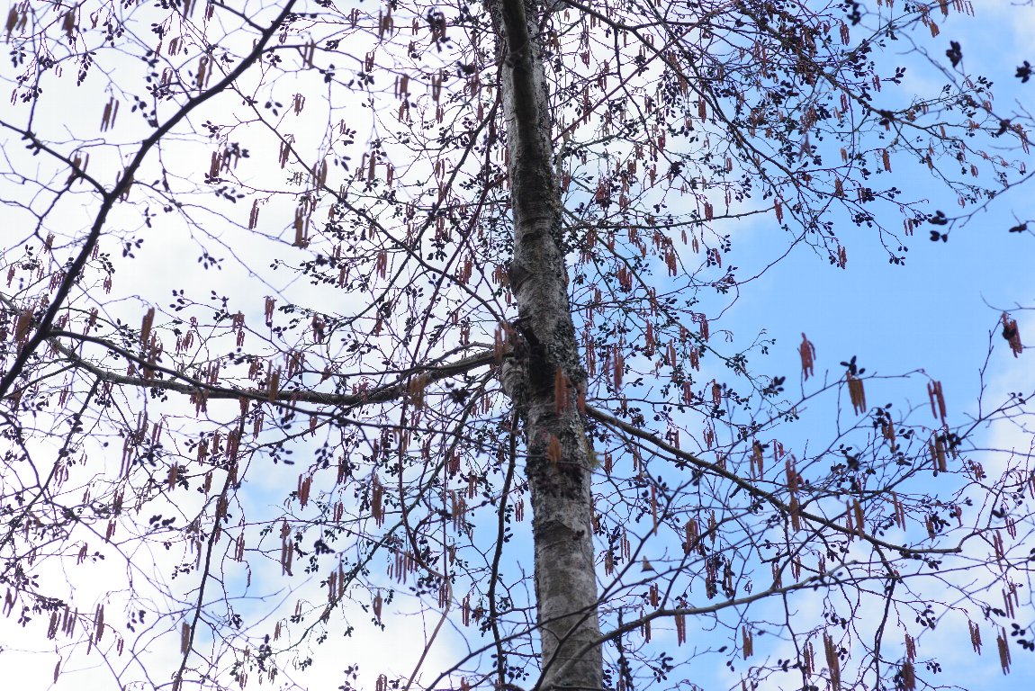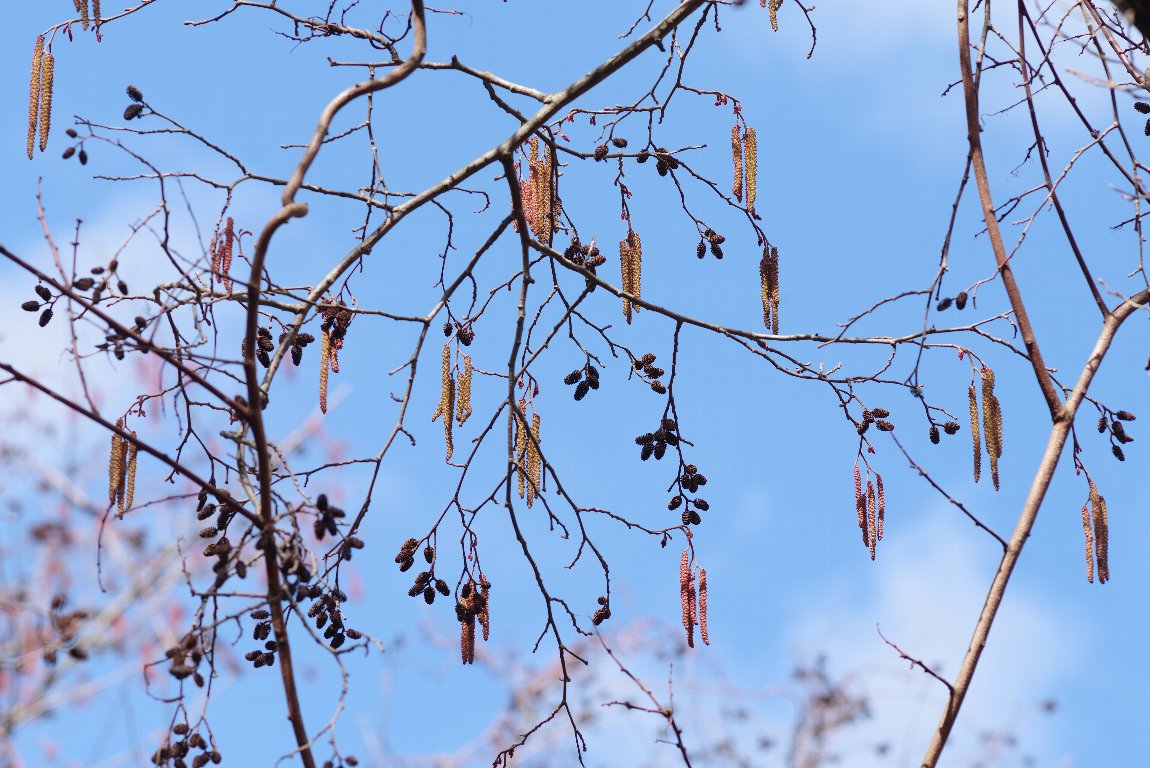 2月の終盤、ケヤマハンノキの大きな木は、もう、花を咲かせている。 といっても、風に花粉を運んでもら風媒花、茶色いブラシのような、地味な姿だ。 黒々とした丸いものは、去年の実の名残り。花と並んで、枝から下がっていた。 |