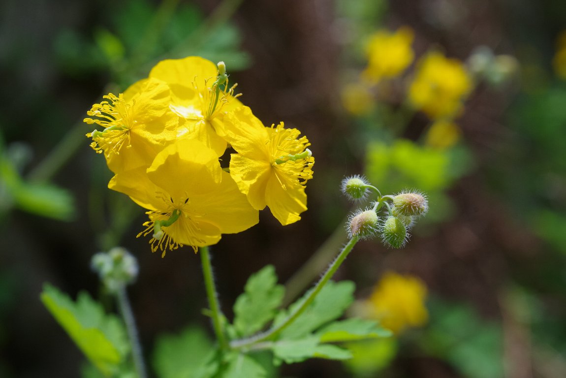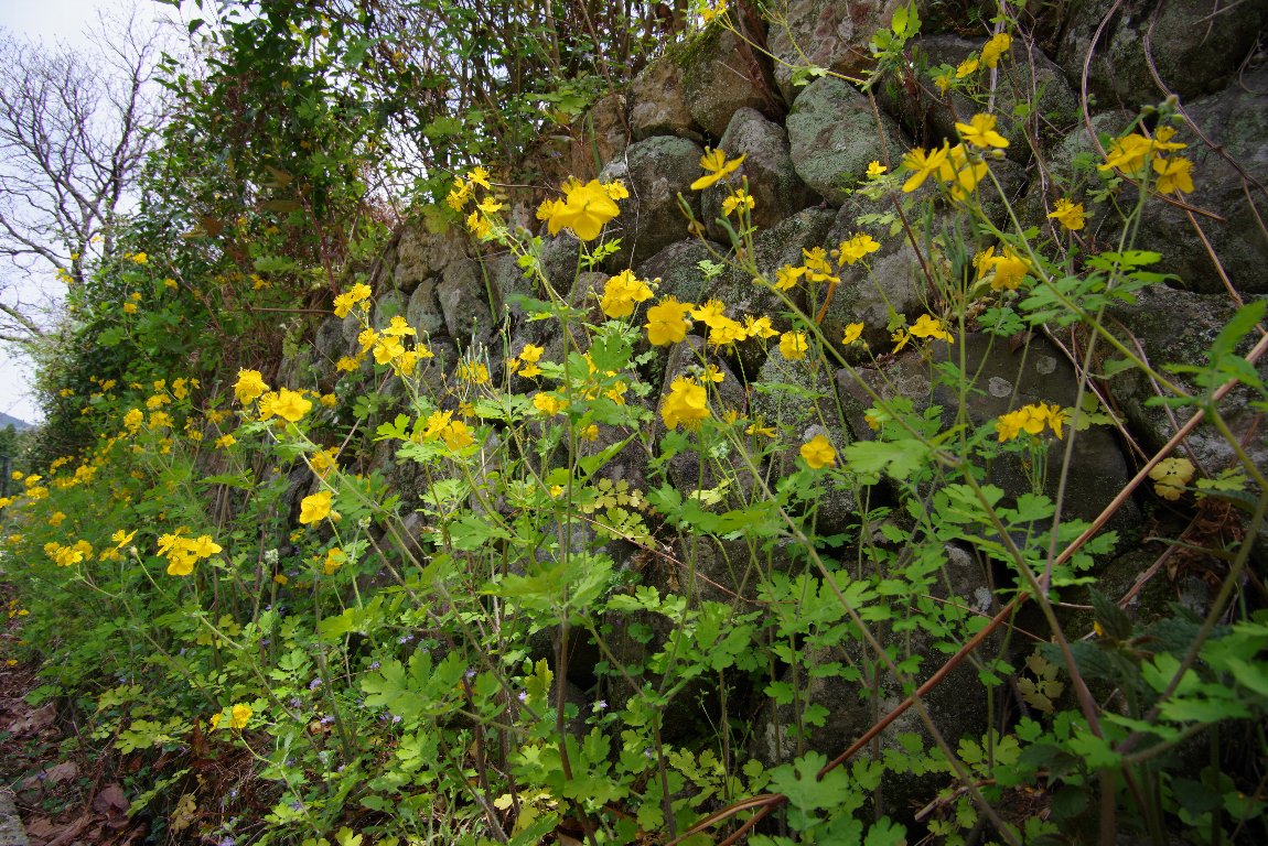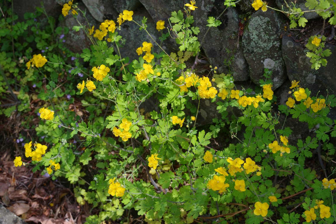 山あいを縫うように走る狭い県道で、突然現れたクサノオウ群落に絶句した。 畑の石垣の隙間から伸びて、びっしりと黄色い花が咲いている。 こんな、撮り放題のクサノオウは、初めてだった。 |
