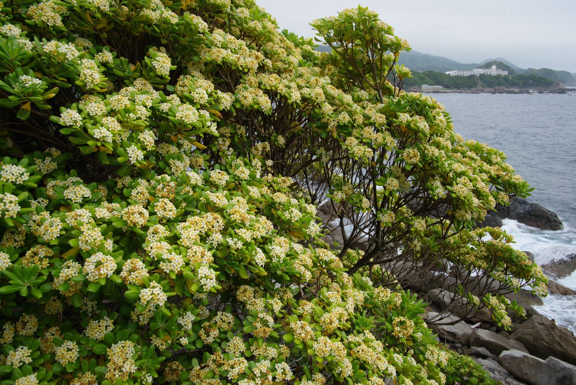 南紀の海岸を覆い尽くすように咲いていたのは、トベラの木。 環境に強いので、道路の垣根として植えられていることも多い。 クリーム色の花越しに、黒潮の海が広がっていた。 |