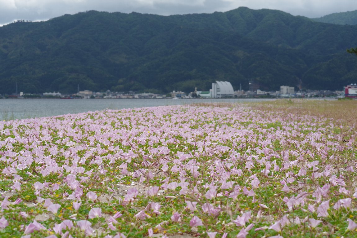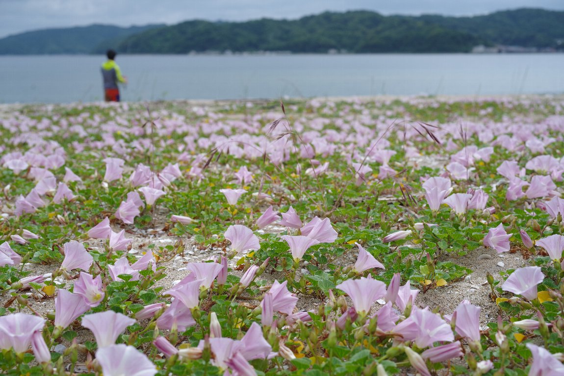 眼前の砂浜に、思いがけず、ハマヒルガオが広がっていた。 延々と続く、花、はな、花。目線を下げれば、ピンクの絨毯が広がる。 曇り空の隙間から日が射すと、一段と鮮やかさが増した。 |