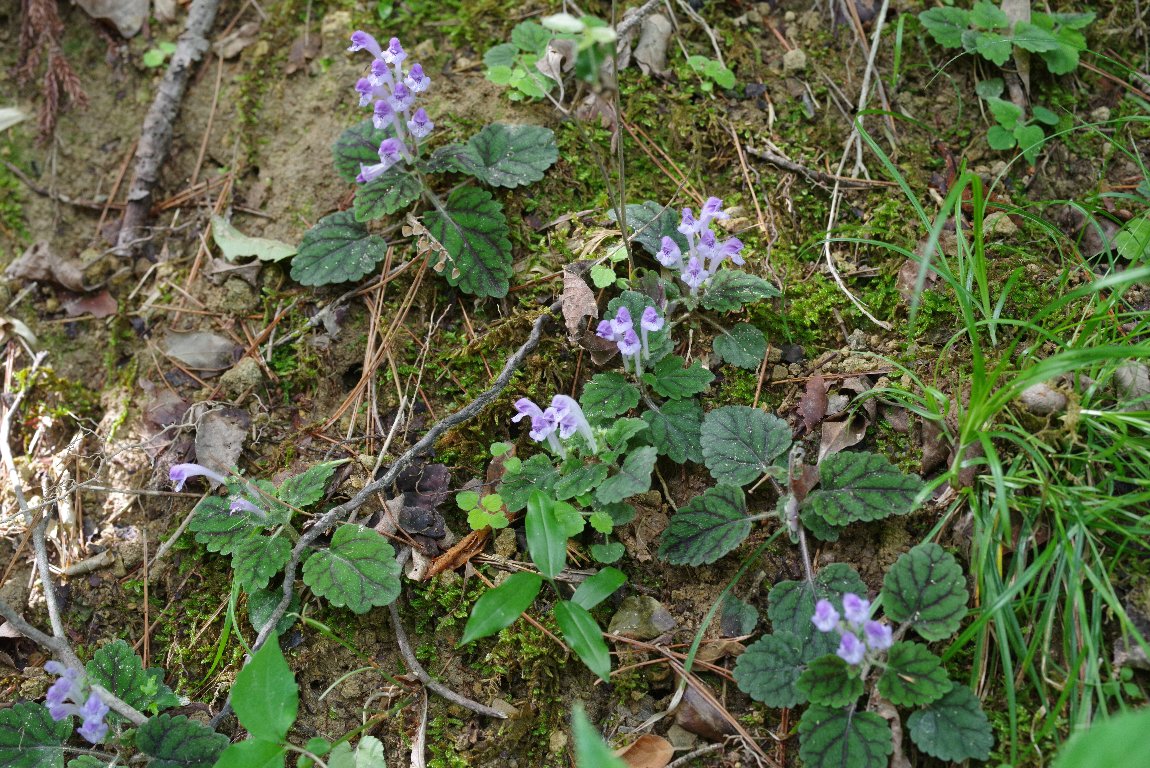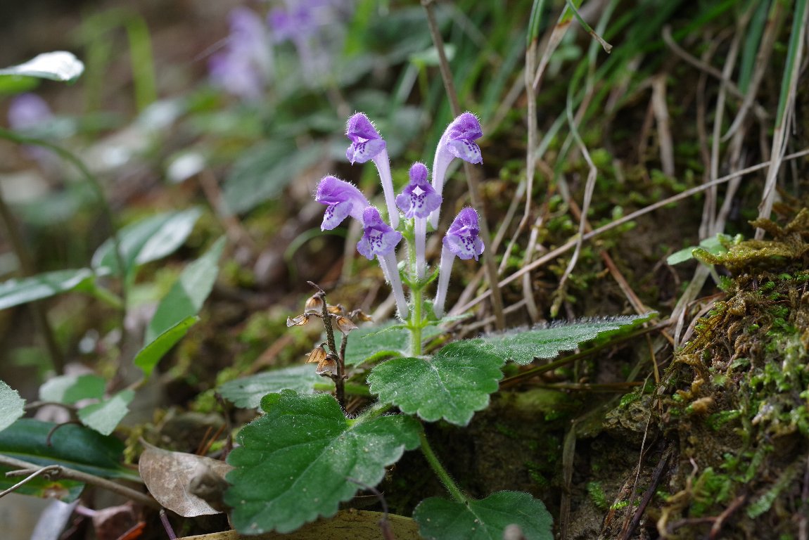 狭い切通しの、少し湿った土の斜面に、シソバタツナミソウが、並んで咲いていた。 射しこんだ日差しを受けて、青紫色の花が、宝石のように輝いていた。 |