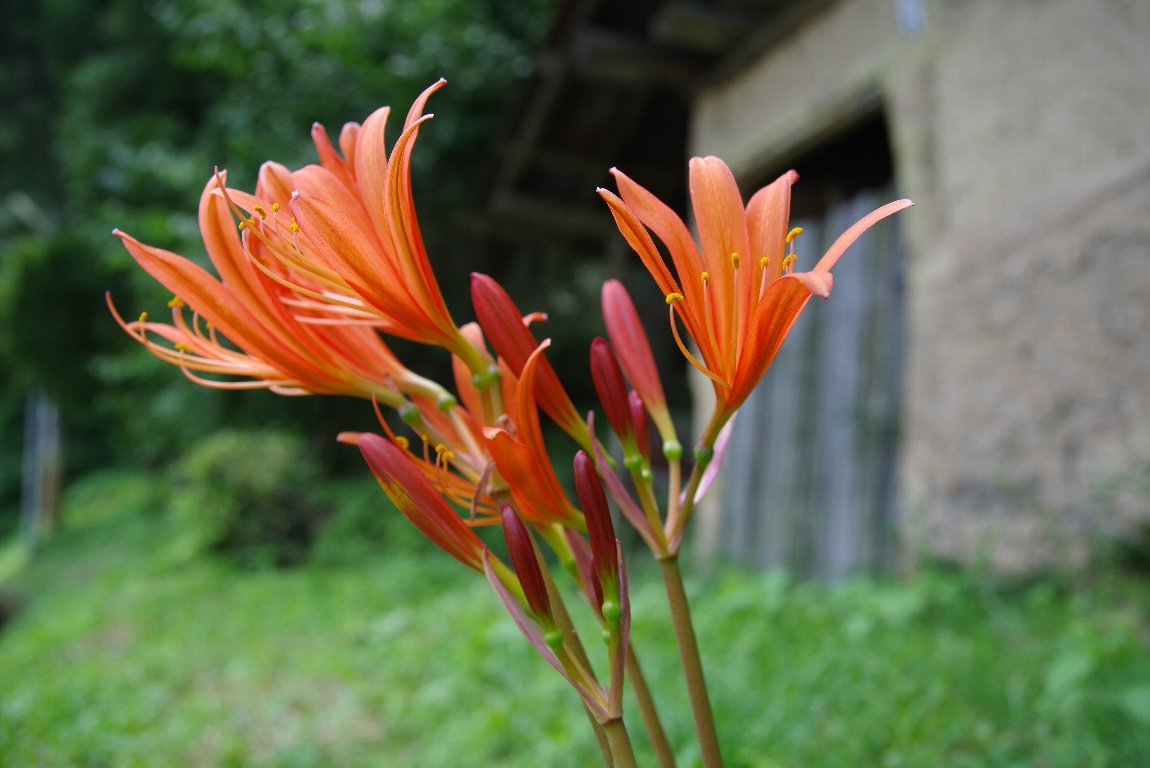 撮影雑記: 夏の後半に咲くキツネノカミソリは、ヒガンバナと同じ仲間で、葉っぱが茂る時期と、花が咲く時期とが 別々です。 なので、花だけが立ちあがって、咲きます。 ヒガンバナほどではありませんが、時に群生して咲きます。 まだ、咲き始めなのでしょうか、この時は、数本のキツネノカミソリが、道端の草むらに咲いていました。 カメラの位置を変えて、アングルをいろいろ考えていると、時おり車が通り過ぎます。 それだったら入れてしまえと、撮ったのが上の写真です。 こちらは、もう少しアップにして、背景に、農作業の道具の保管庫をバックにしてみました。 ![]() この花が咲きだすと、そろそろ、夏から秋に移りゆくんだな、という気分になります。 でも、まだまだ、当分、暑いですけどね。 |