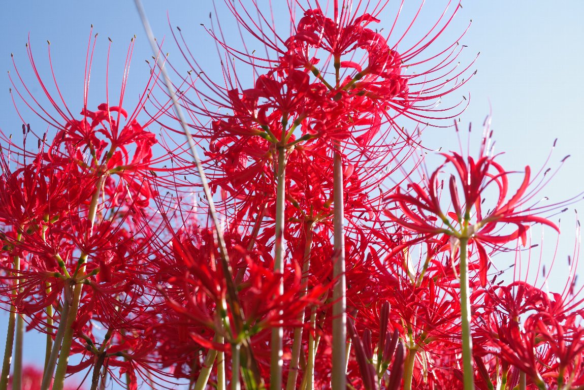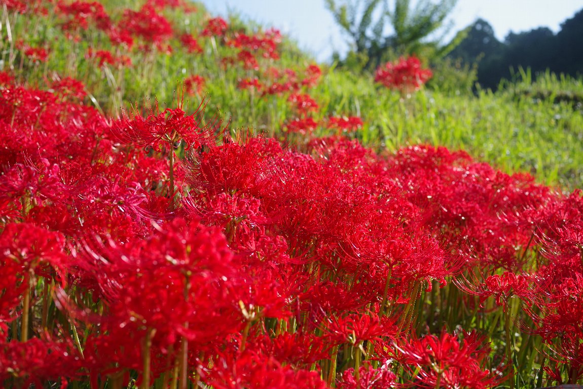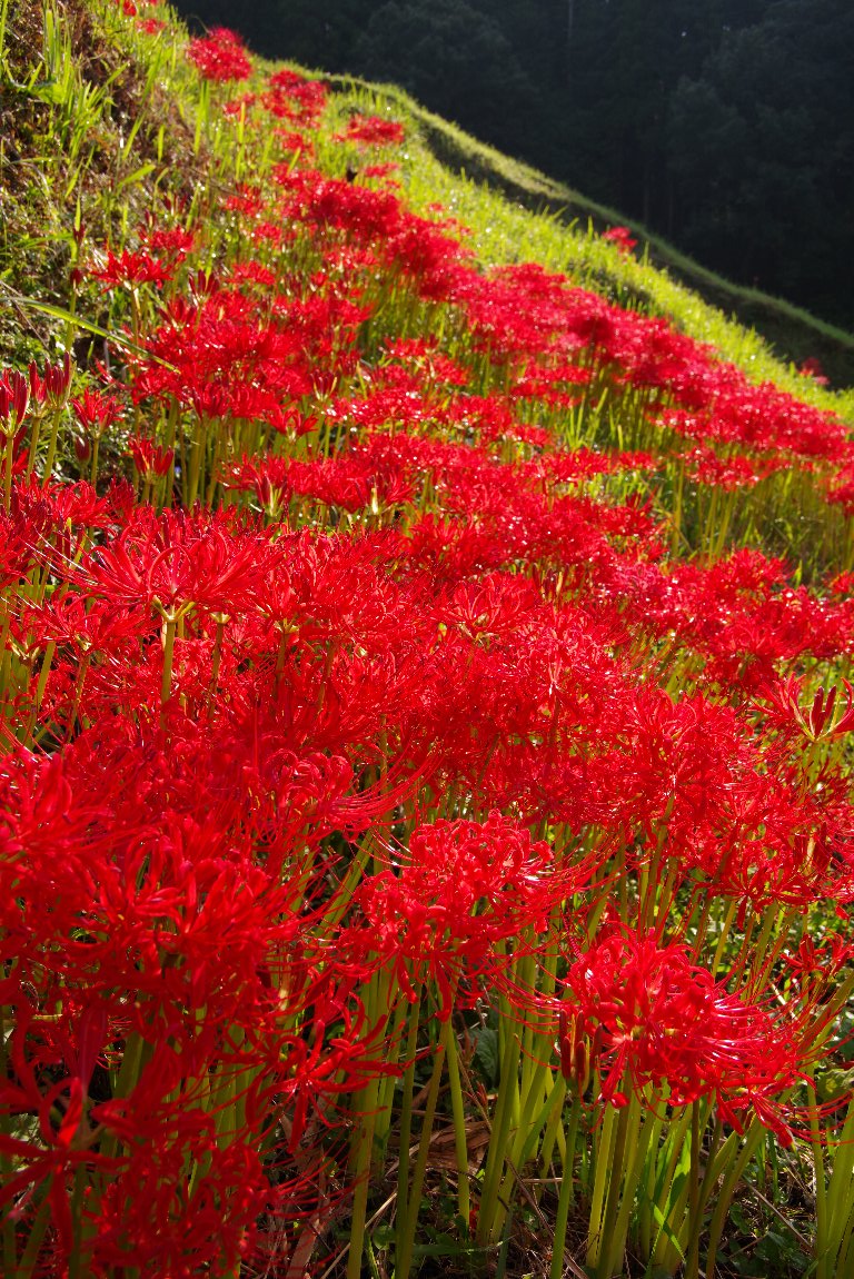 撮影雑記: この年は、9月の秋分の日の頃に、休みを取って、故郷に帰省しました。 生家近くまで来ると、車から、棚田わきの川沿いの土手に、ヒガンバナが広がって咲いて いるのが見えました。 翌朝、撮影に向かいました。 車を停め、川沿いを歩いて、花の咲く、真っただ中へ。 撮り始めのころは曇っていたのですが、雲が切れて、朝日が射してきました。 真っ赤なヒガンバナの絨毯が、輝いています。 ![]() 密度の濃いヒガンバナの花は、押し寄せる赤い波のようです。 ![]() 青空にも映えます。 ![]() 帰省で、ヒガンバナの花を撮ることは、特に考えていなかったのですが、思いがけず、 見事なヒガンバナの写真を撮ることができました。 |