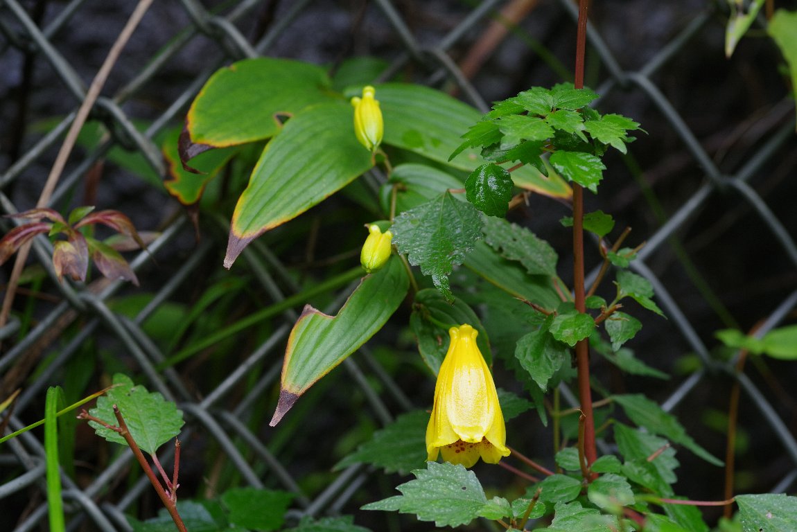 キイジョウロウホトトギスは、川沿いの岩場の斜面で見かける。 ところが、道路沿いの斜面は、落石防止の金網で覆われているところが多い。 でも、ほら、金網の間を縫って、黄色い花を元気に咲かせていますよ。 |
