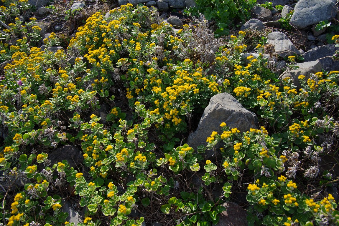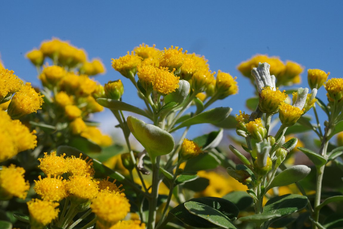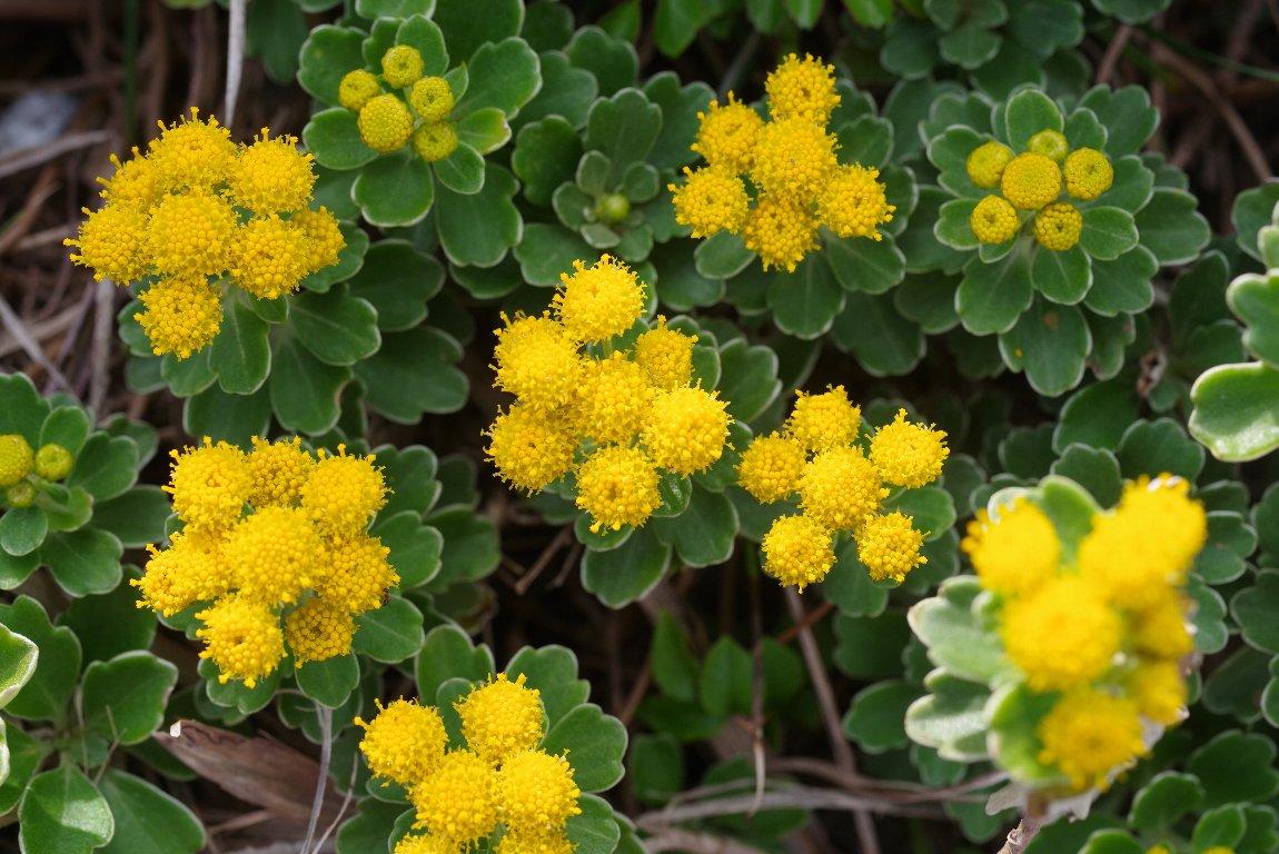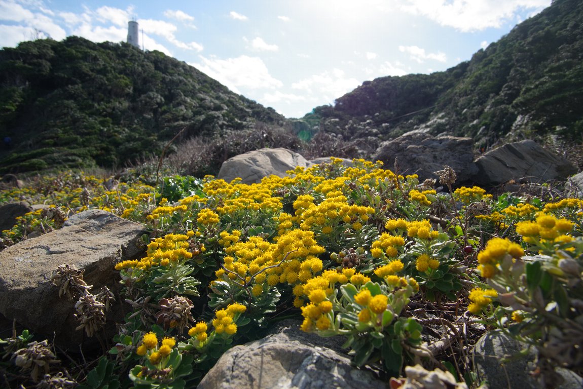 シオギクを求めて、徳島県の海岸にやってきた。 着いてみると、ガレ地が広がる浜辺のあちこちに、雑然と黄色い坊主頭のような花々。 たくましさを感じる咲き姿だった。 |